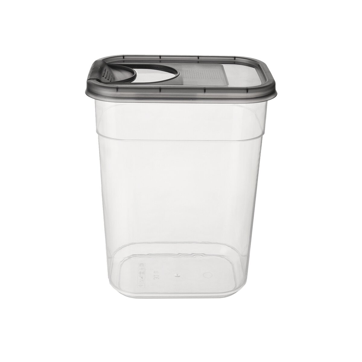 Kód produktu 127186Obdĺžniková plastová dóza veľkosti 16,5x11,5x16,7 cm so šedým viečkom, ktoré má posúvaciu časť, takže vložené suroviny a drobné predmety je možné ľahko vysypať.