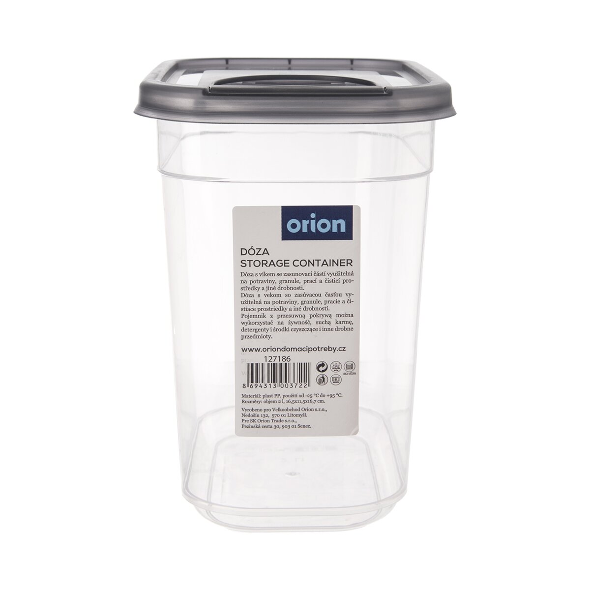 Viac informáciíPraktickú dózu GREY môžete využiť napríklad na uskladnenie pokrmov, suchých surovín, múky, strúhanky, raňajkových cereálií a pod. Je vyrobená z kvalitného PP plastu a má objem 2 l.
