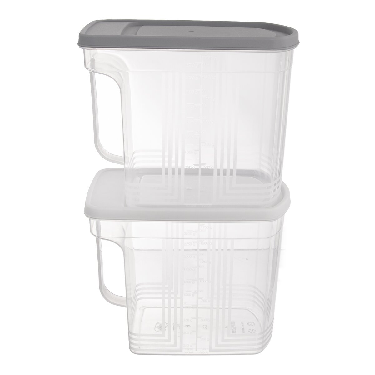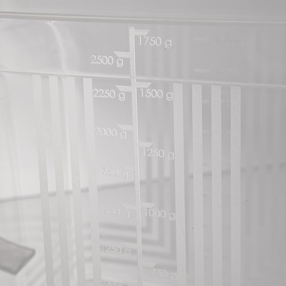 Jej viečko zabraňuje nielen navlhnutiu potravín, ale aj ich rozsypaniu v špajze alebo preberaniu chutí a vôní okolitých surovín. Dóza je transparentná, vďaka čomu ľahšie rozpoznáte jej obsah. Navyše sú na nej vytlačené odmerné stupnice pre tekuté aj sypké potraviny – pre vodu a mlieko od 250 ml do 2,5 l, pre cukor od 250 g do 2,5 kg alebo pre múku od 250 g do 1,75 kg. Špeciálny tvar viečka umožňuje stohovanie nádob.