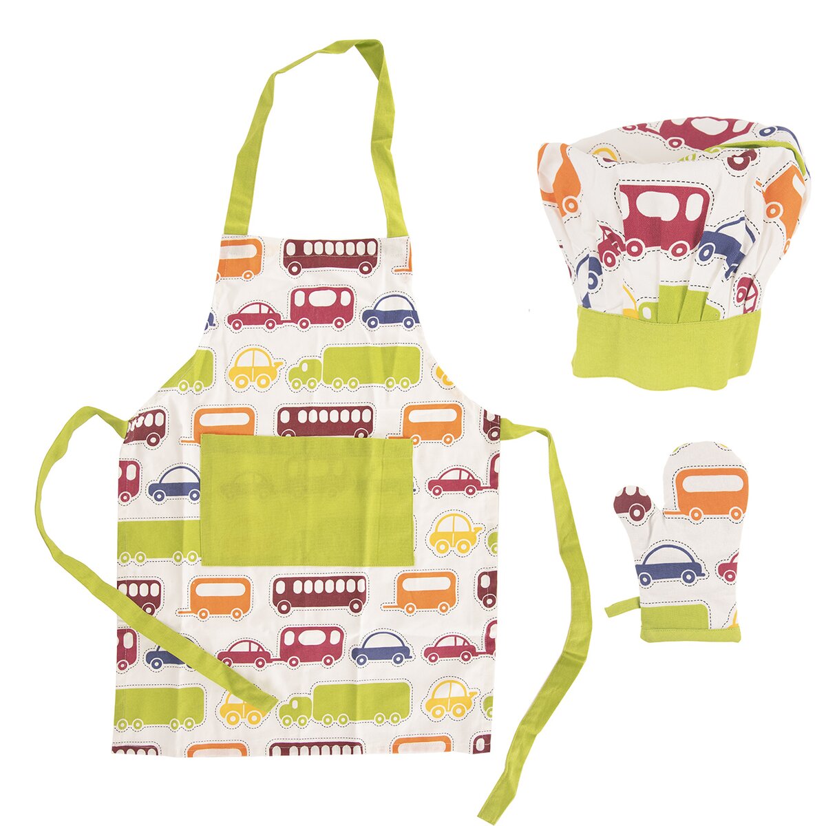 Ak máte doma malých kuchárov, kúpte im túto detskú súpravu obsahujúcu bavlnenú kuchynskú zásteru, čiapku a chňapku s pútkom na zavesenie. Deti zaujme farebný vzor áut a automobilov. Naopak rodičia zaiste ocenia viazanie zástery.