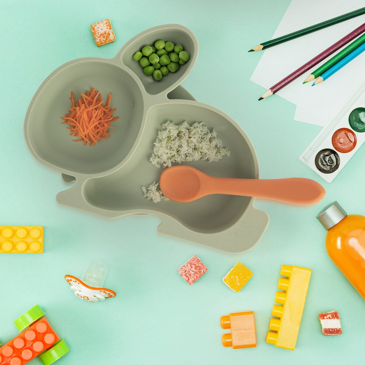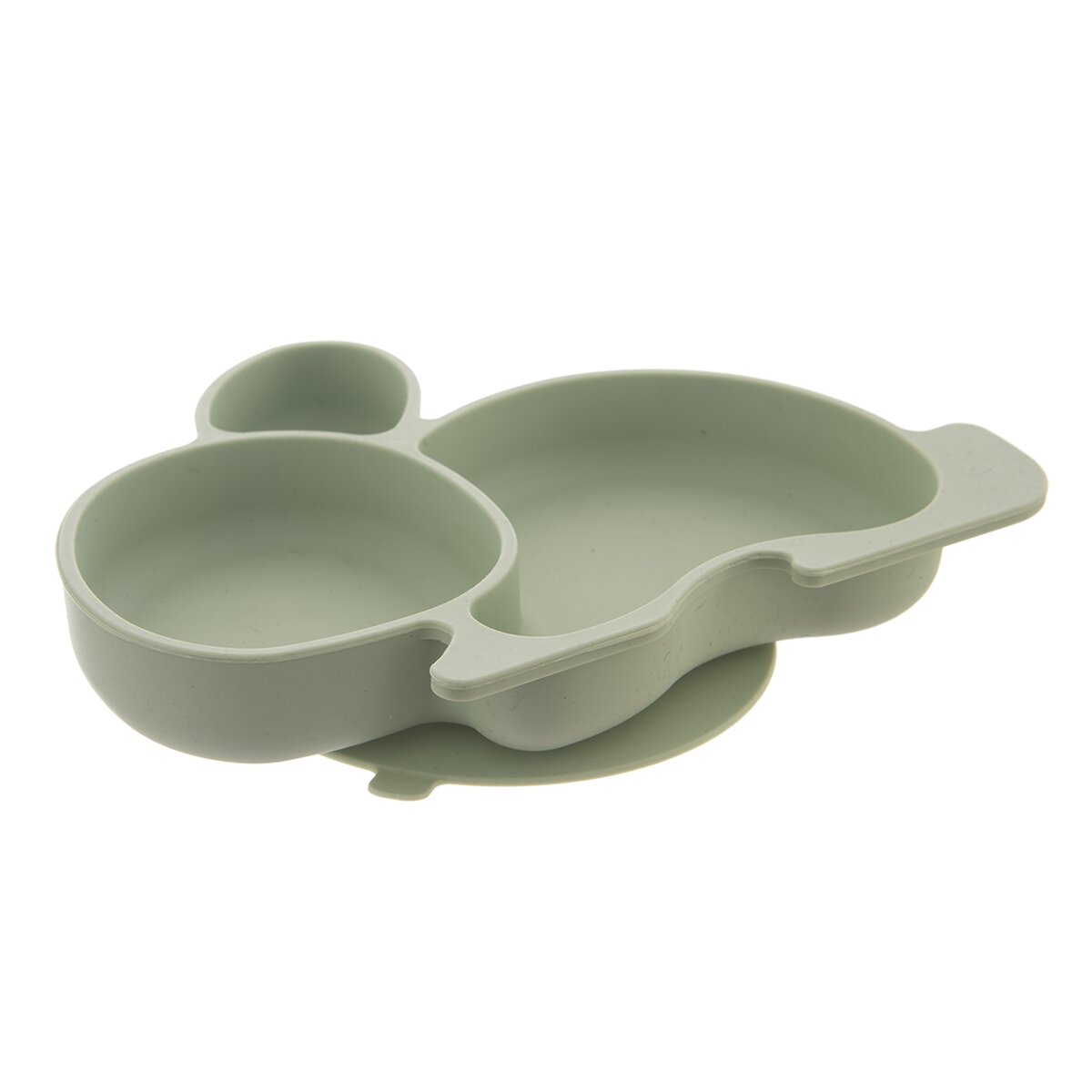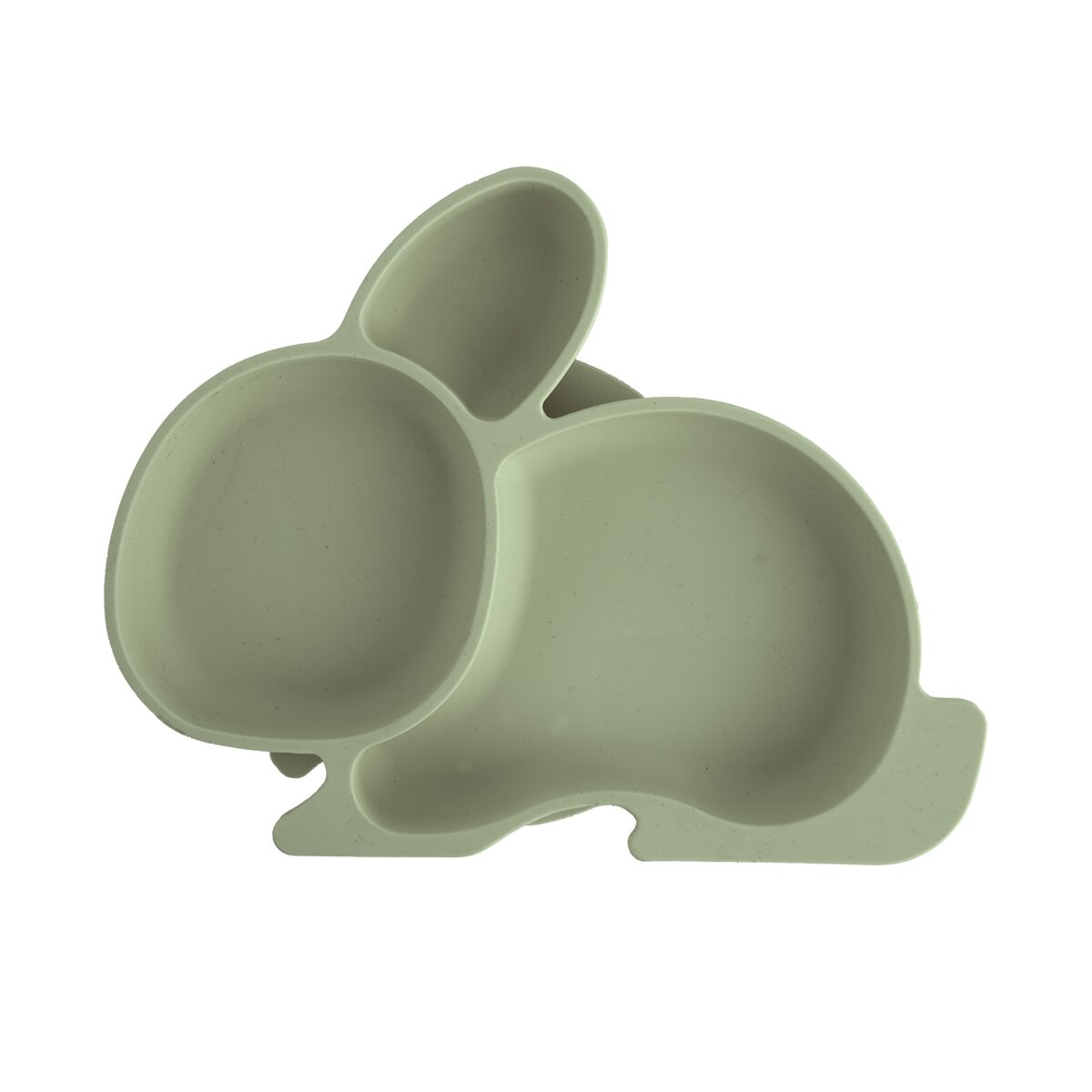 Kód produktu 129573Silikónový tanier v tlmenej zelenej farbe je určený na podávanie jedál malým deťom. Tvar zajačika je členený na 3 sekcie, veľká prísavka navyše udrží tanier na mieste.