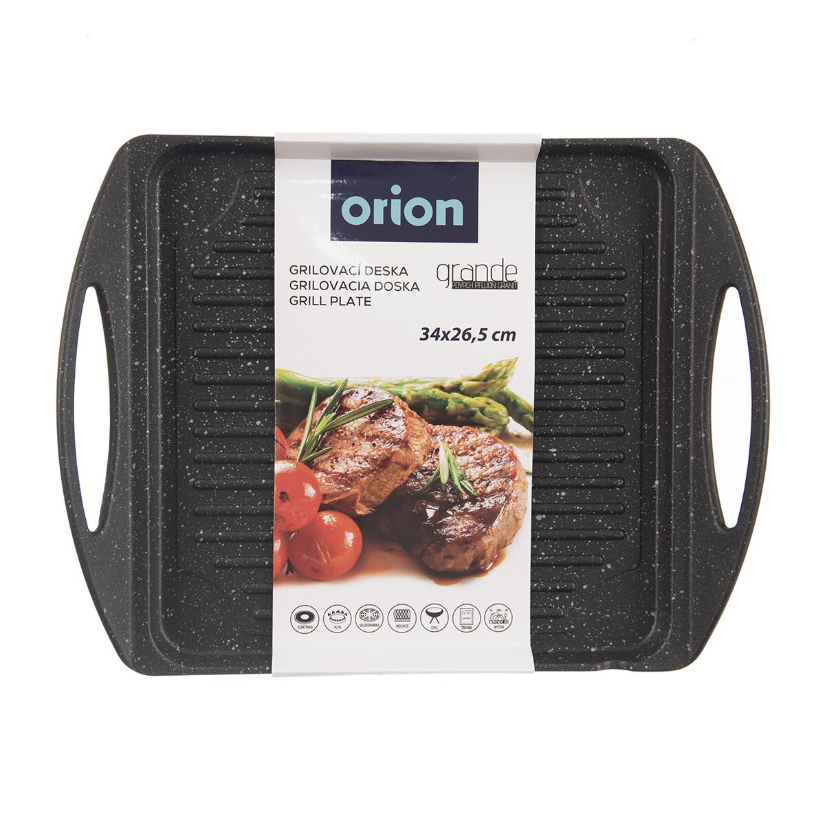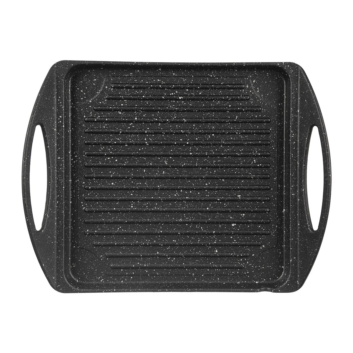 Kód produktu 111181Zaoblená nepriľnavá grilovacia doska s vrúbkovaným povrchom pre prípravu steakov, rýb i zeleniny na všetkých typoch sporákov, v rúre aj na grile.