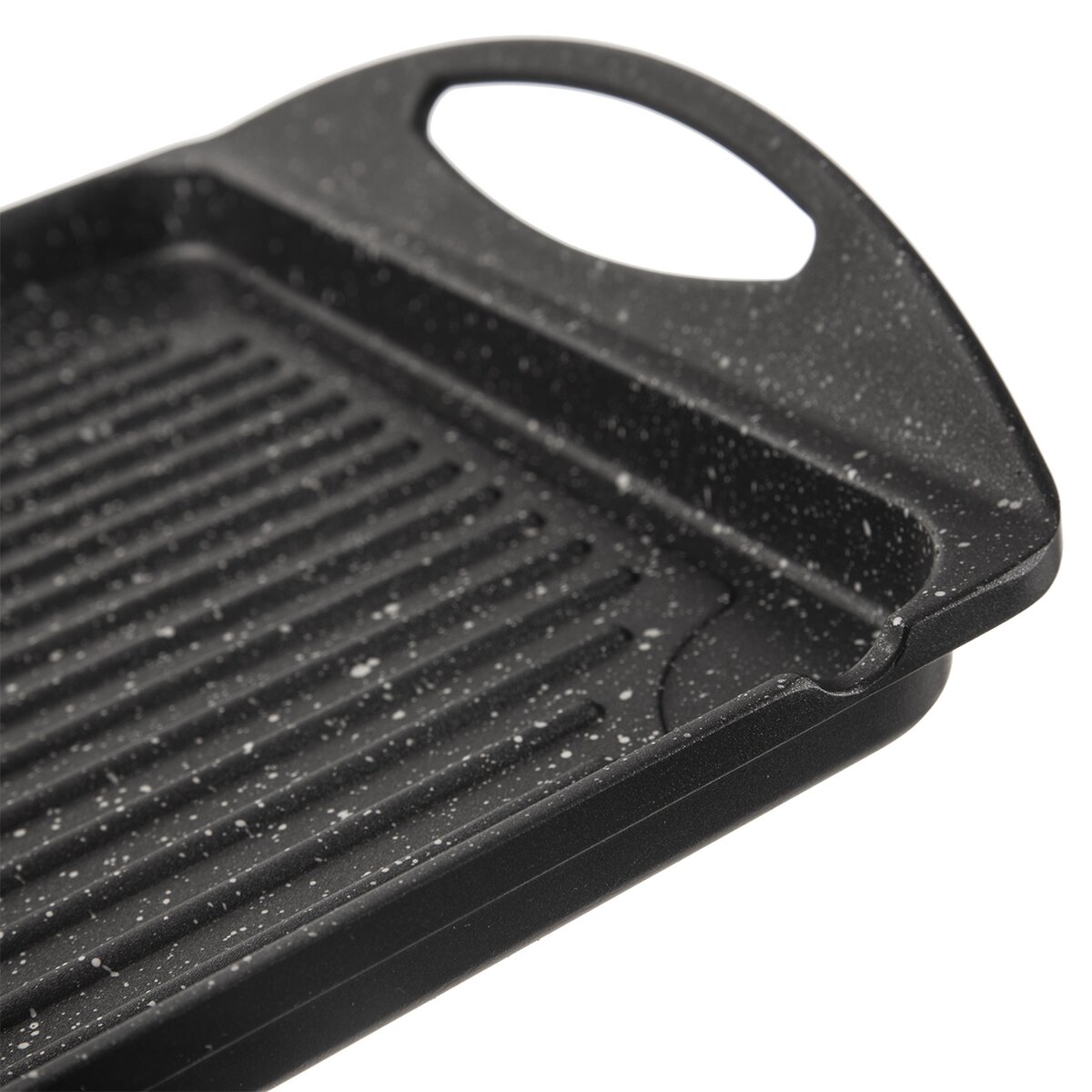 Viac informáciíMenšia grilovacia doska veľkosti 34x26,5x5,5 cm, s typickou rebrovanou štruktúrou má veľmi kvalitný nepriľnavý povrch PFLUON GRANIT, na ktorom pripravíte výborné steaky s minimálnou potrebou tuku. Grilovať môžete mäso, zeleninu, ryby, morské plody aj údeniny. A hamburgery aj žemličky získajú typickú "pruhovanú" grilovaciu vzorku.