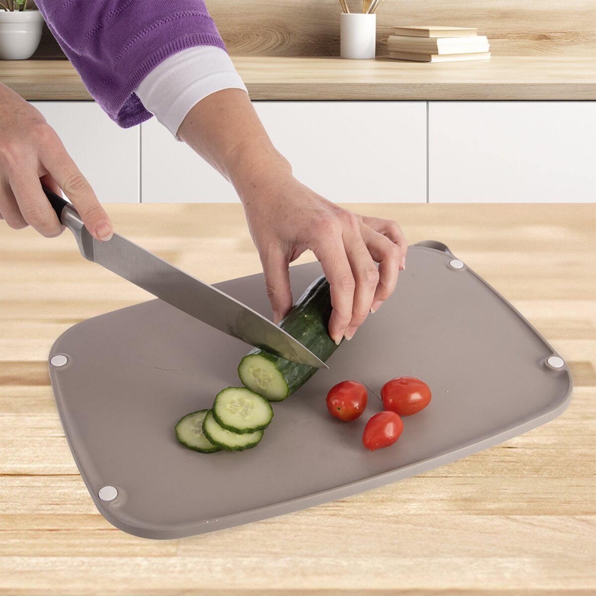 Viac informáciíPraktická doska s hladkou krájacou plochou má mierny sklon, takže aj pri krájaní šťavnatejších potravín, napr. mäsa, paradajok, ovocia, tekutina stečie ku kraju a nedôjde k zašpineniu kuchynskej linky. Je multifunkčná, opatrená z oboch strán protišmykovými podložkami.