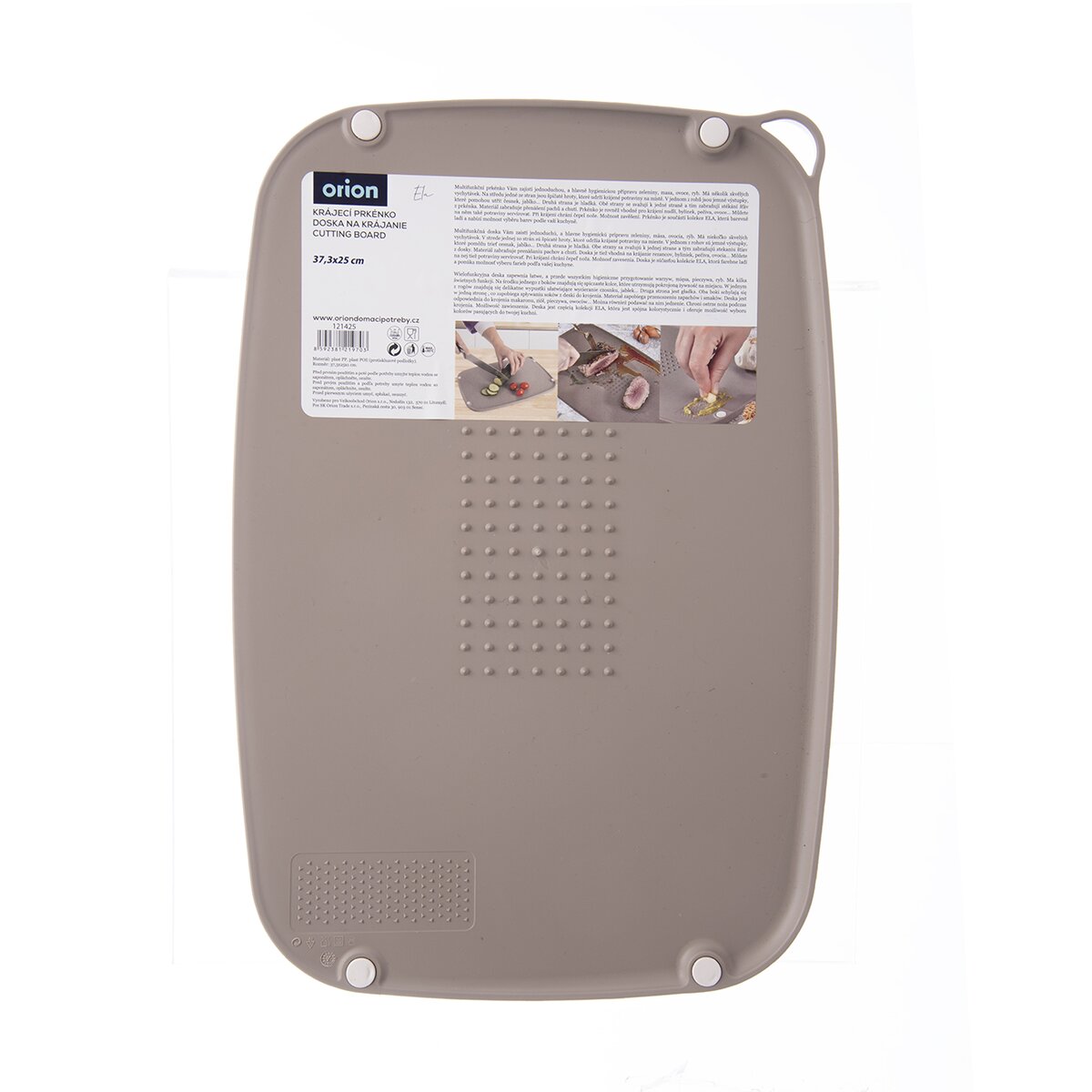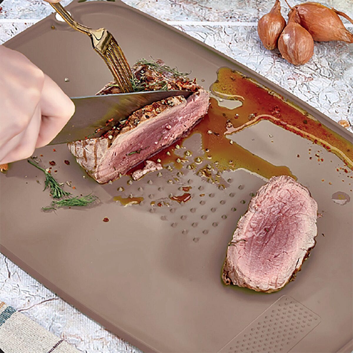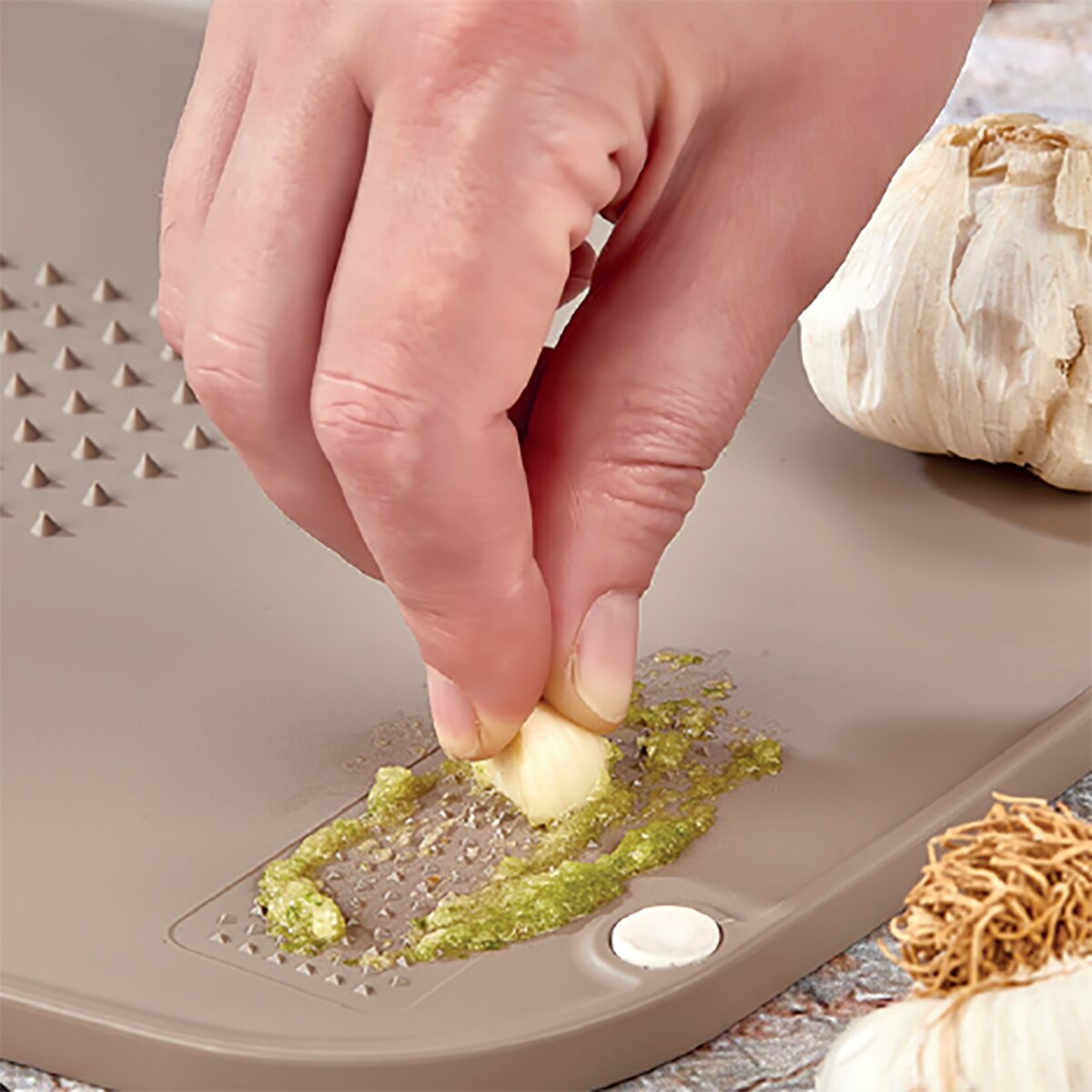 Kód produktu 121425Hnedá plastová doska s miernym sklonom na krájanie najrôznejších potravín. Je obojstranná, z jednej strane univerzálna hladká plocha, z druhej má uprostred výstupky, ktoré udržia potraviny na jednom mieste, drobné hroty zase pomôžu s trením cesnaku. Má protišmykové podložky.