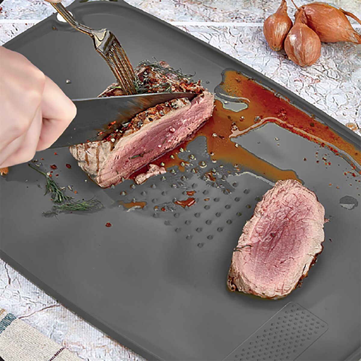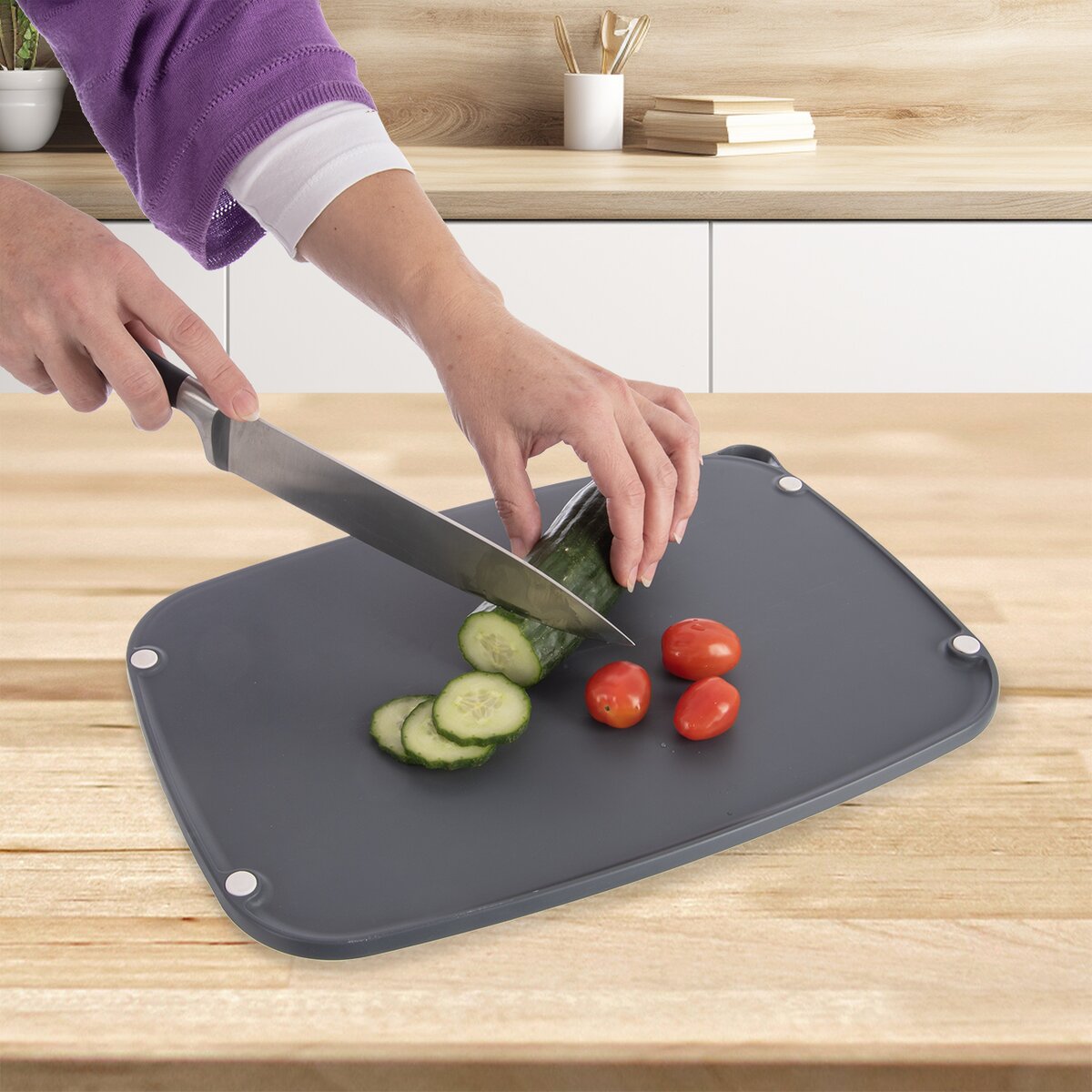Viac informáciíPraktická doska s hladkou krájacou plochou má mierny sklon, takže aj pri krájaní šťavnatejších potravín, napr. mäsa, paradajok, ovocie, tekutina stečie ku kraju a nedôjde k zašpineniu kuchynskej linky. Je multifunkčná, opatrená z oboch strán protišmykovými podložkami.