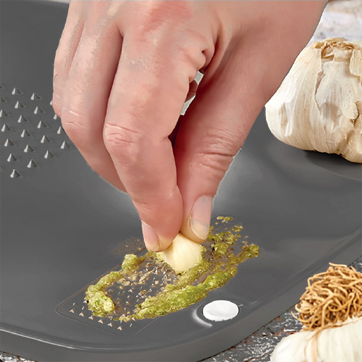 Kód produktu 121426Sivá plastová doska s miernym sklonom na krájanie najrôznejších potravín. Je obojstranná, z jednej strane univerzálna hladká plocha, z druhej má uprostred výstupky, ktoré udržia potraviny na jednom mieste, drobné hroty zase pomôžu s trením cesnaku. Má protišmykové podložky.