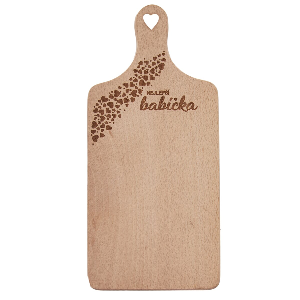Kód produktu 126815Drevená doska na krájanie v rozmere 30×14 cm s praktickou rukoväťou a vypaľovaným dekorom NEJLEPŠÍ BABIČKA.