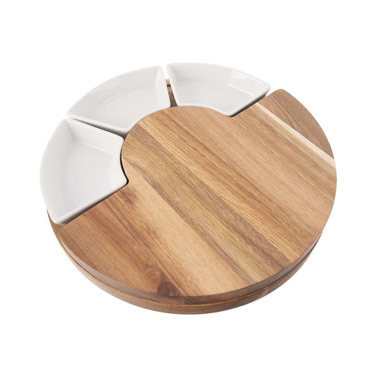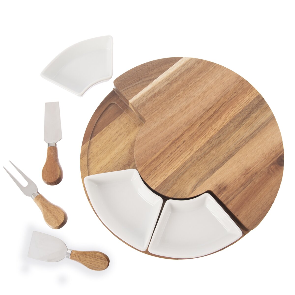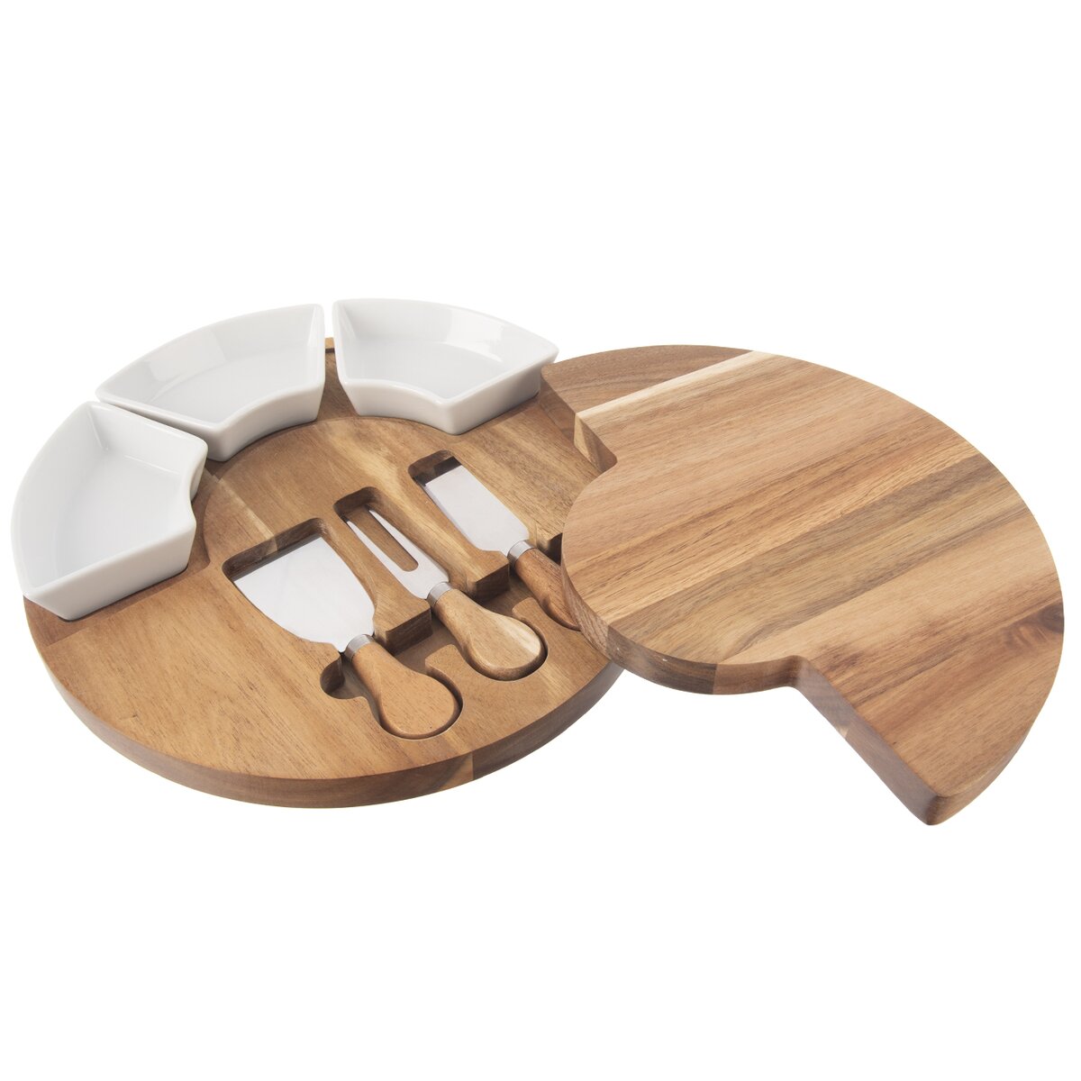 Kód produktu 126843Sada akáciovej dosky na krájanie s priemerom 28 cm ukrýva 3 krájače na syr s dĺžkou 13 cm a je doplnená 3 keramickými miskami na oriešky, olivy, dipy alebo rôzne drobné krekry.