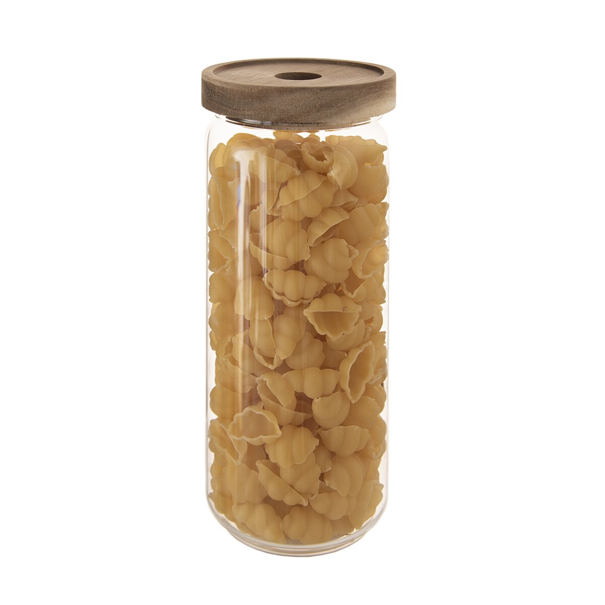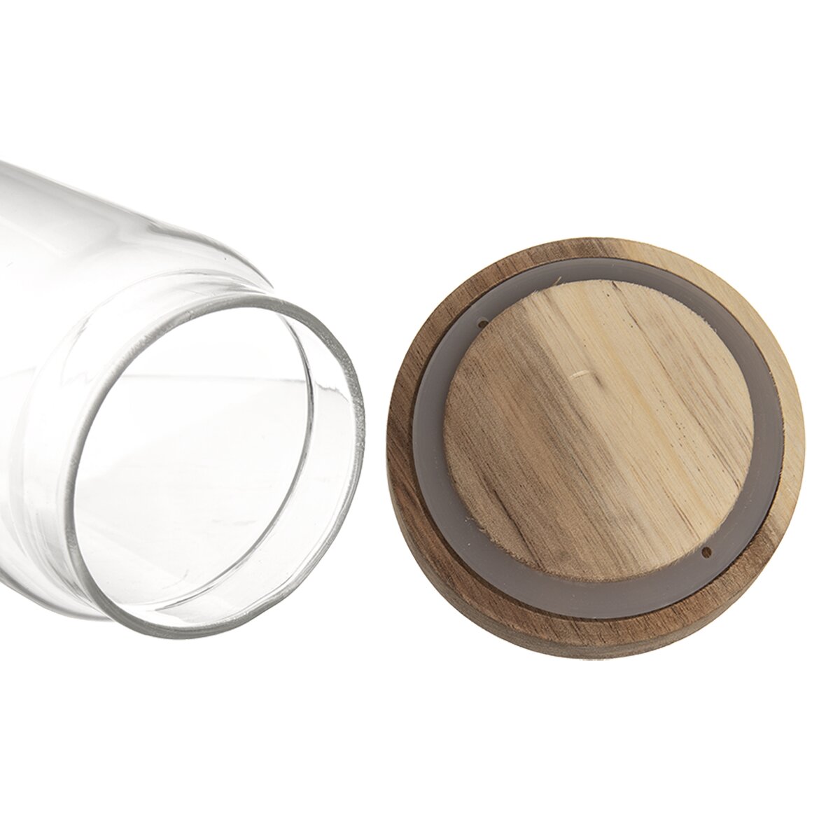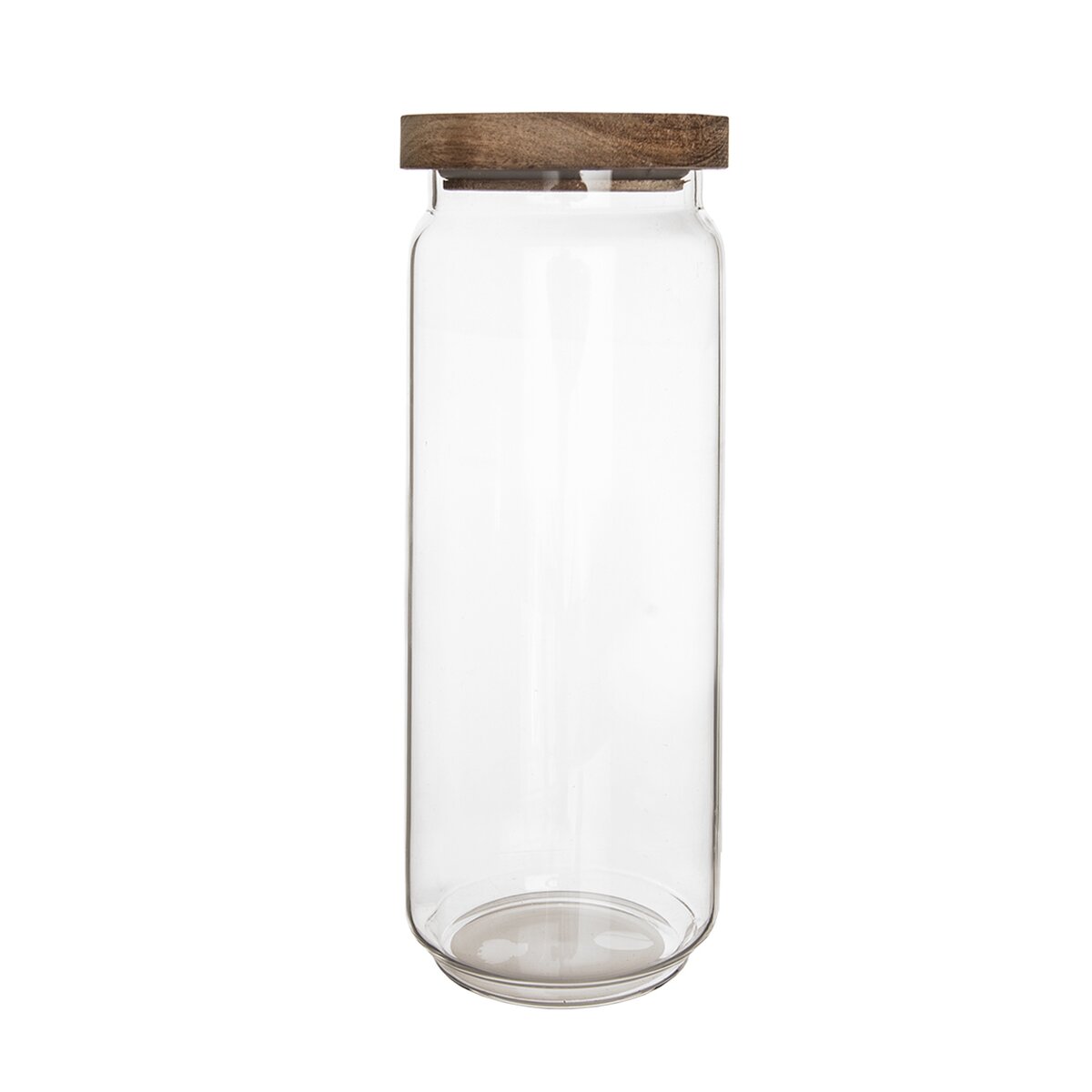 Kód produktu 127555Okrúhla sklenená dóza s objemom 1 l je vhodná na uskladnenie najrôznejších surovín na varenie a pečenie. Uzatvára sa viečkom z akáciového dreva, opatreného silikónovým tesnením.