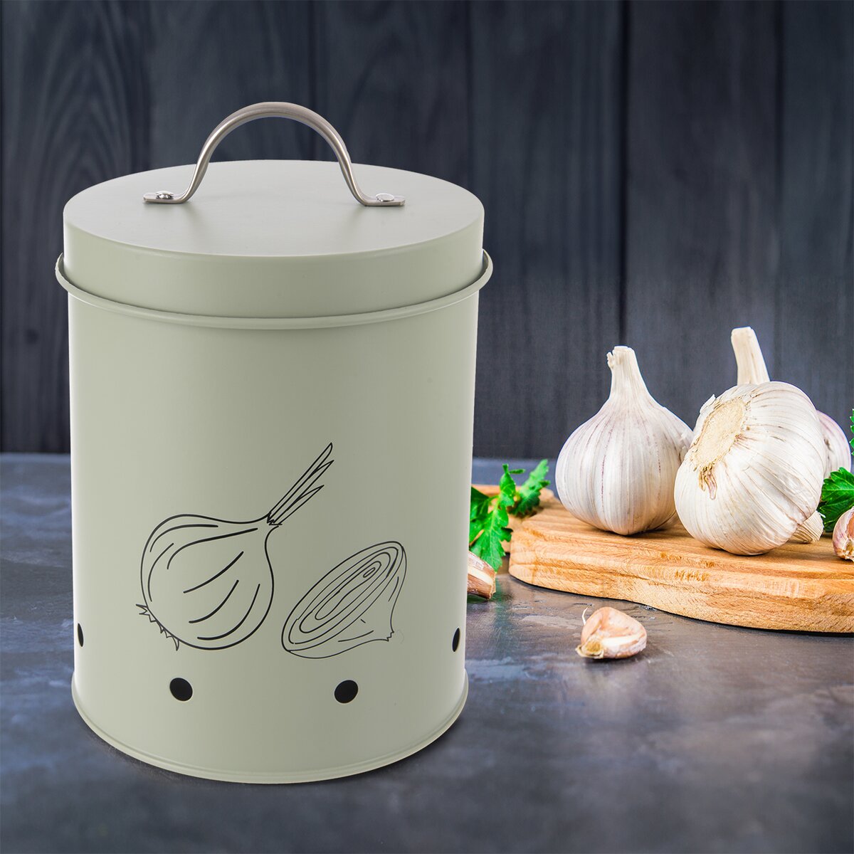 Potlač napovie, aký obsah dóza ukrýva. Táto štýlová dóza bude skvelým miestom na uloženie cesnaku. Súčasťou je aj viečko s držadlom. Ventilačné otvory zaisťujú cirkuláciu vzduchu, zamedzujú hromadeniu vlhkosti a tepla a tým zabraňujú klíčeniu, vzniku plesní a zaisťujú dlhšiu trvanlivosť. Navyše je aj dizajnovým kúskom.