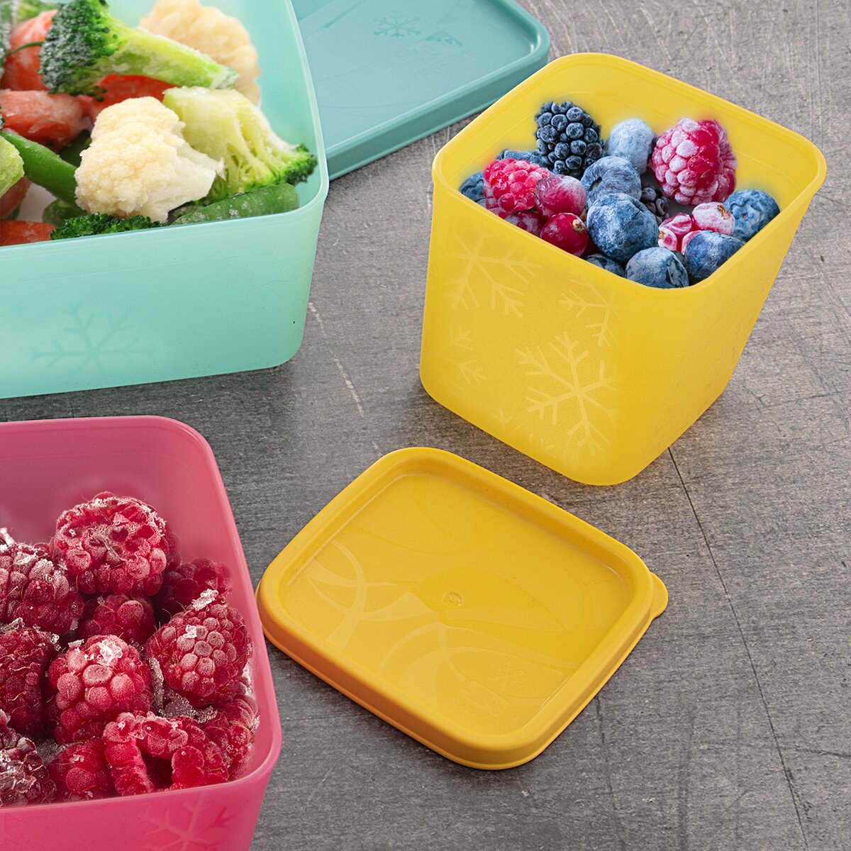 Kód produktu 127104Plastová dóza FROST s objemom 0,38 l s farebným viečkom. Vhodná na ukladanie potravín v mrazničke a chladničke.