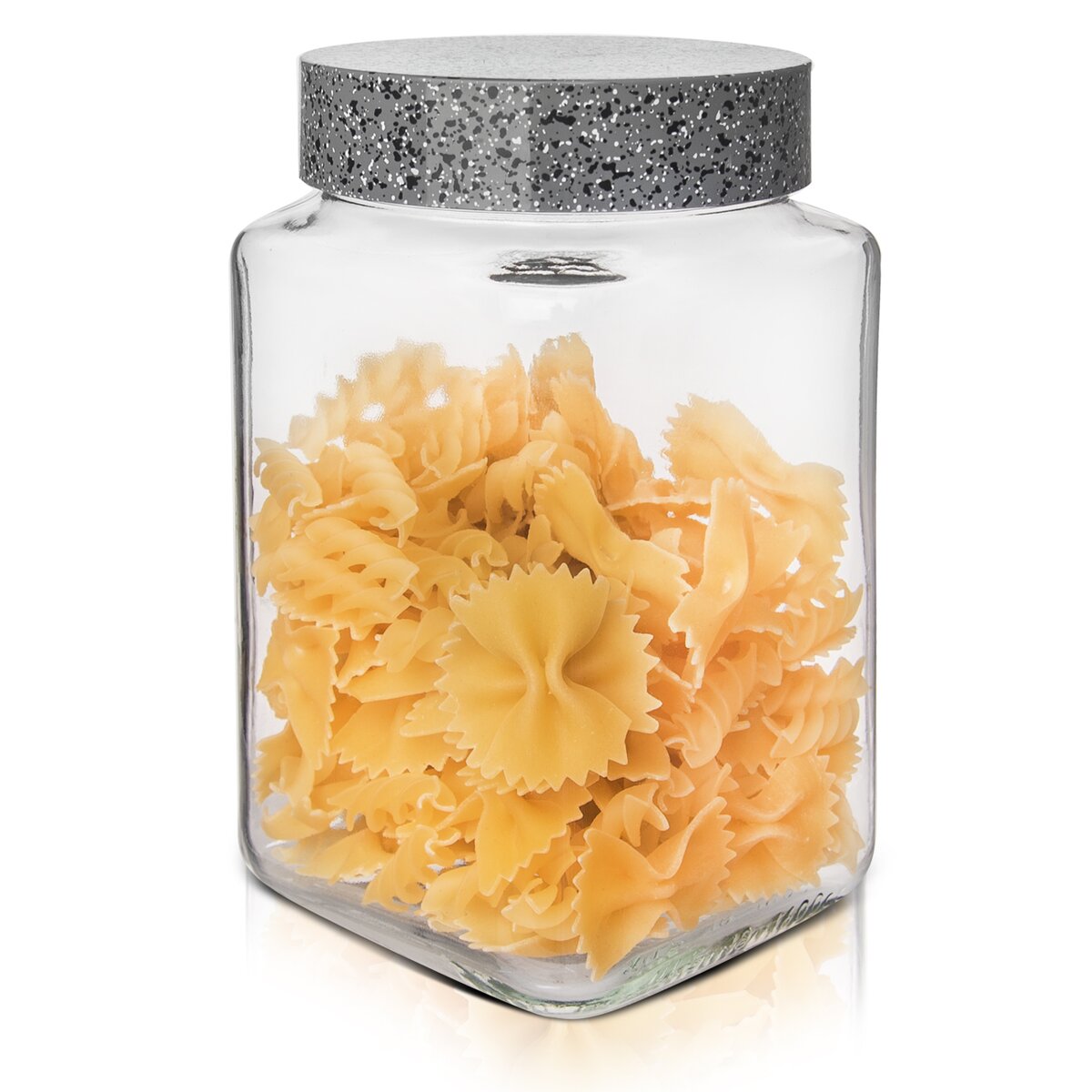 Kód produktu 153684Hranatá sklenená dóza GRANIT s objemom 1,5 l s plastovým viečkom v dekore šedej žuly.