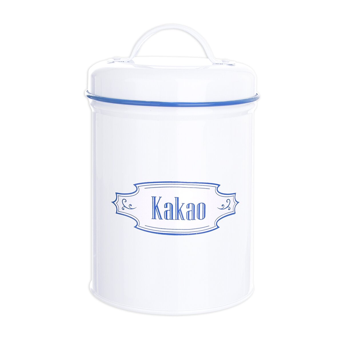 Kód produktu 153647Dóza s viečkom na uloženie kakaa. Materiál: plech, Rozmery: pr. 11 cm, v. 18,5 cm.