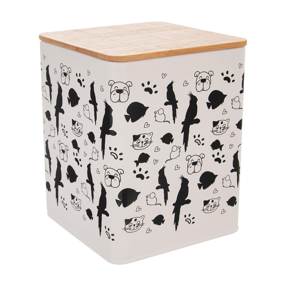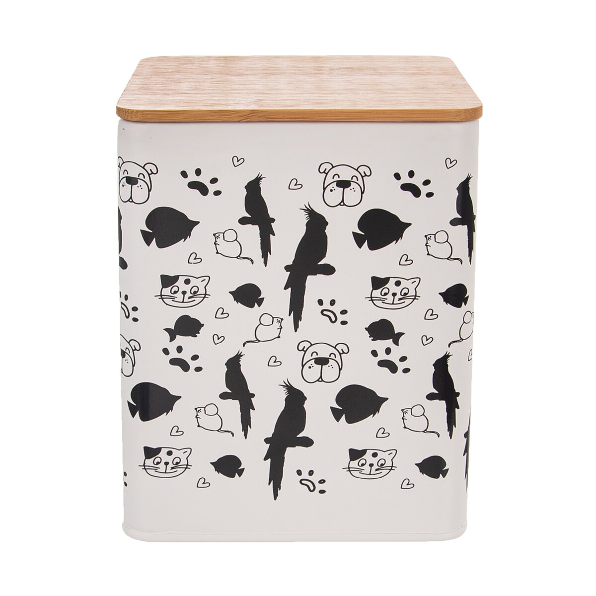 Kód produktu 127532Hranatá plechová dóza v rozmere 11,5x11,5x14 cm, so zaujímavou potlačou a s viečkom. Vhodná na uloženie maškŕt alebo sušienok pre domácich miláčikov.
