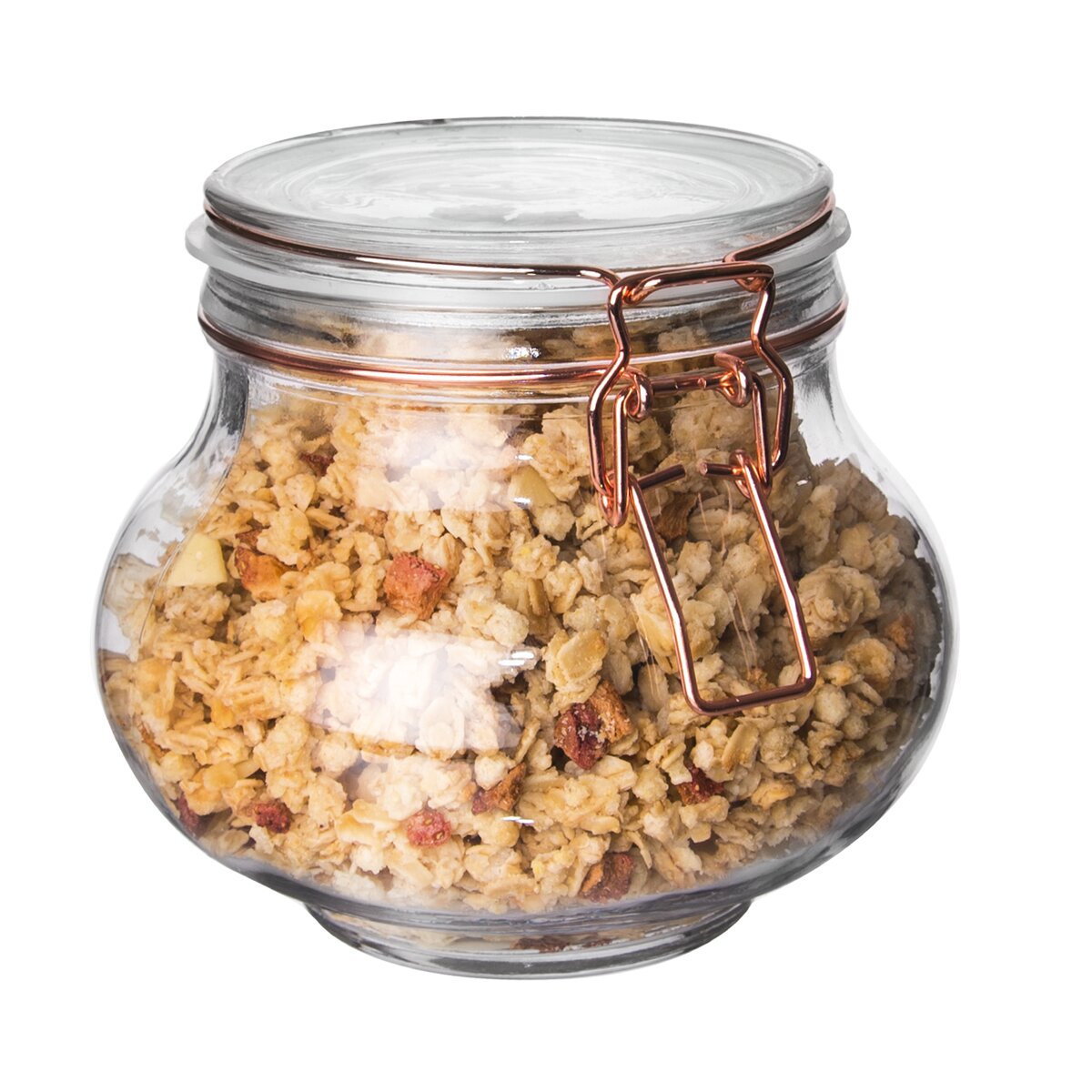 Dóza s pevným patentným uzatváraním a s tesnením. Materiál: sklo, silikónové tesnenie, kovová pracka. Rozmery: objem 1,25 l, pr. 15 cm, v. 12,5 cm.