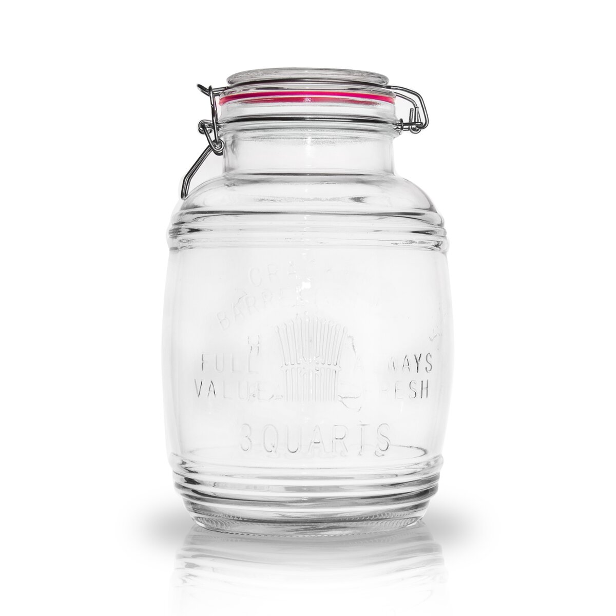 Sklenená dóza s drôteným patentovým uzáverom a so silikónovým tesnením. Tvar súdku. Rozmery: objem 3 l, pr. 15,5 cm, v. 24 cm.