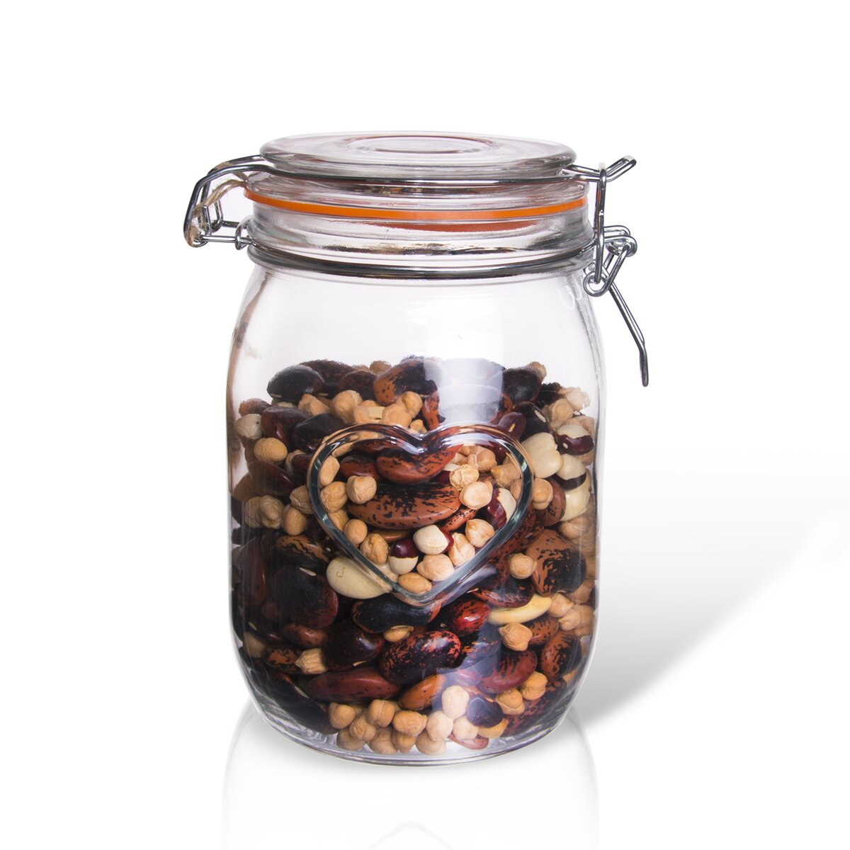 Pevné utesnenie jej obsahu zaisťuje silikónové tesnenie a patentný drôtený uzáver. Môže byť aj krásnym hand made darčekom, naplnená vo vrstvách orieškami a semienkami. Pozornosť zaujme svojim jemným plastickým dekórom srdca. Pokiaľ do nej vložíte napríklad sviečku alebo kamienky, bude z nej krásna dekorácia na váš stôl.