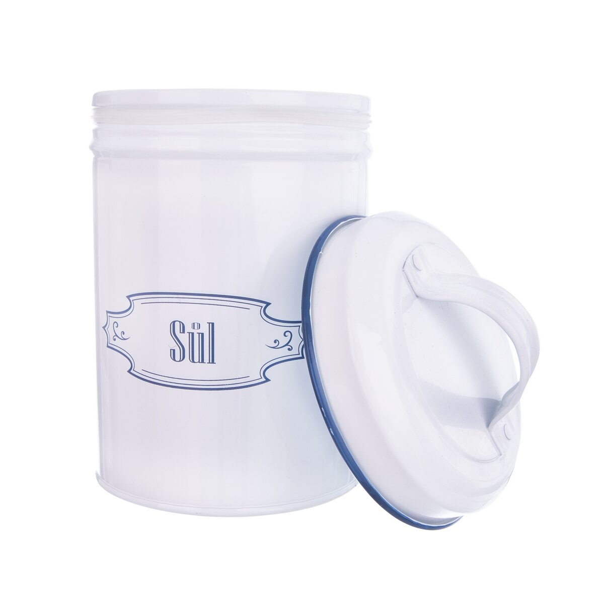 Kód produktu 153661Dóza s viečkom na uloženie soli. Materiál: plech, Rozmery: pr. 11 cm, v. 18,5 cm.