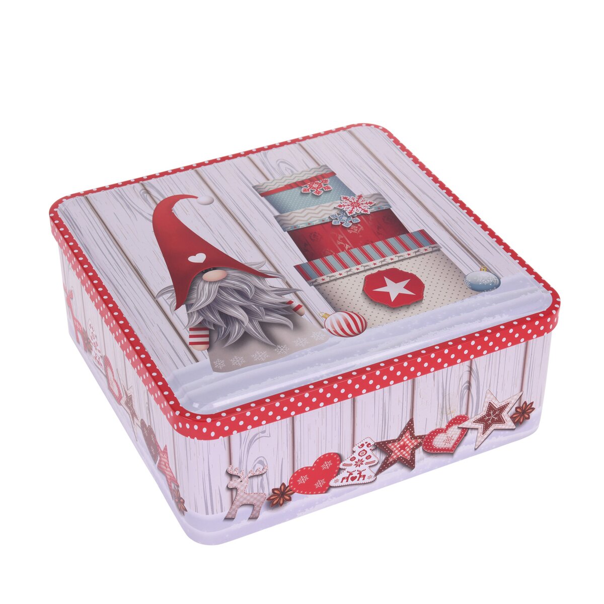 Kód produktu 127526Dóza s vekom na uloženie cukroviniek aj iných potravín. Materiál: plech. Rozmery: 20x20x8 cm.