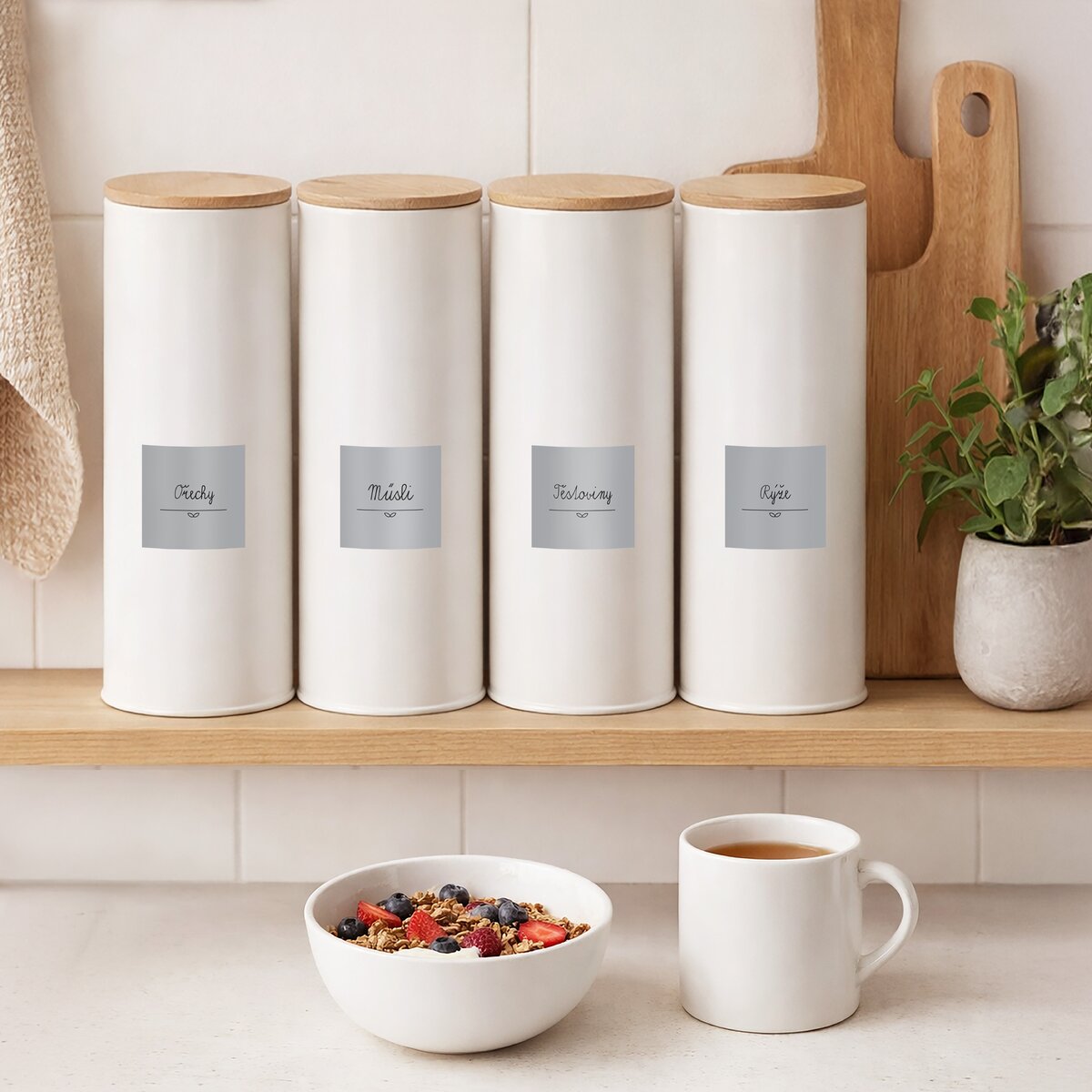 Kód produktu 127542Plechová biela dóza s objemom 2,65 l, s bambusovým viečkom a silikónovým tesnením, vhodná na uloženie špagiet, makarónov, rezancov a iných surovín.