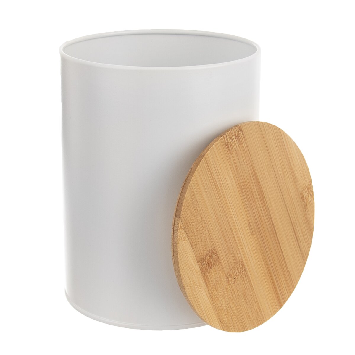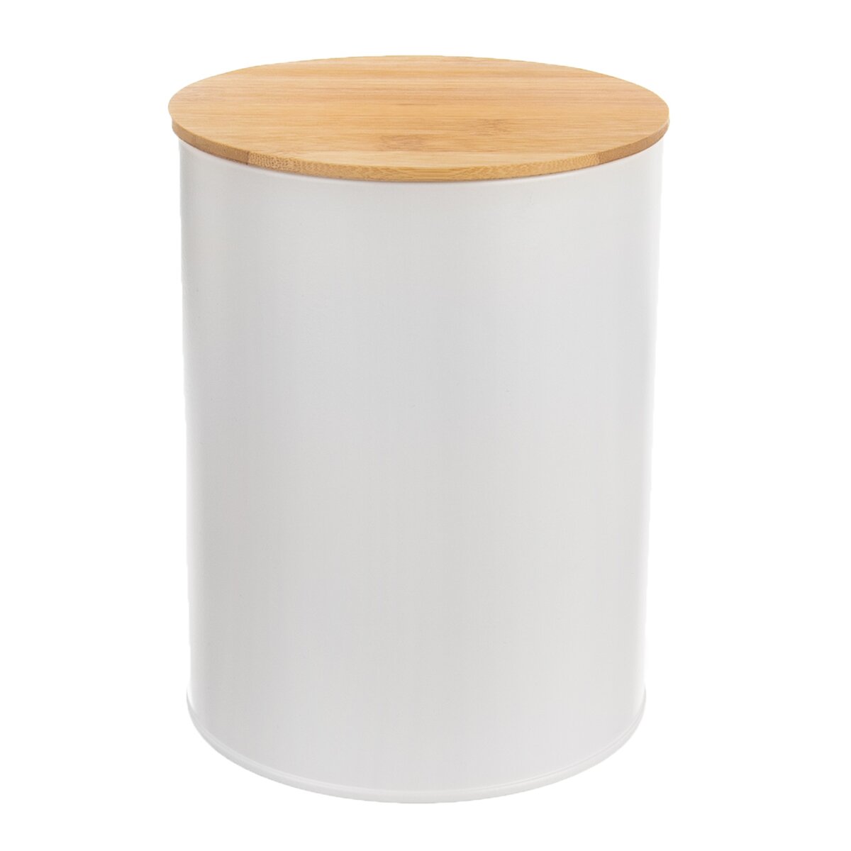 Kód produktu 127541Plechová biela dóza s objemom 2,3 l, s bambusovým viečkom a silikónovým tesnením, vhodná na uloženie múky, cestovín, ryže, cukru a iných sypkých surovín.