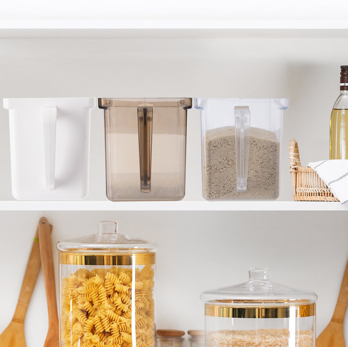 Táto priesvitná plastová zásobnica poslúži na tradičný spôsob ukladania sypkých potravín. Poznali ju už naše babičky, v kredenci do nich ukladali najpoužívanejšie suroviny na varenie a pečenie. Jej rozmery sú 19×10,5×12 cm a hodia sa na uskladnenie múky, cukru, soli alebo cestovín.