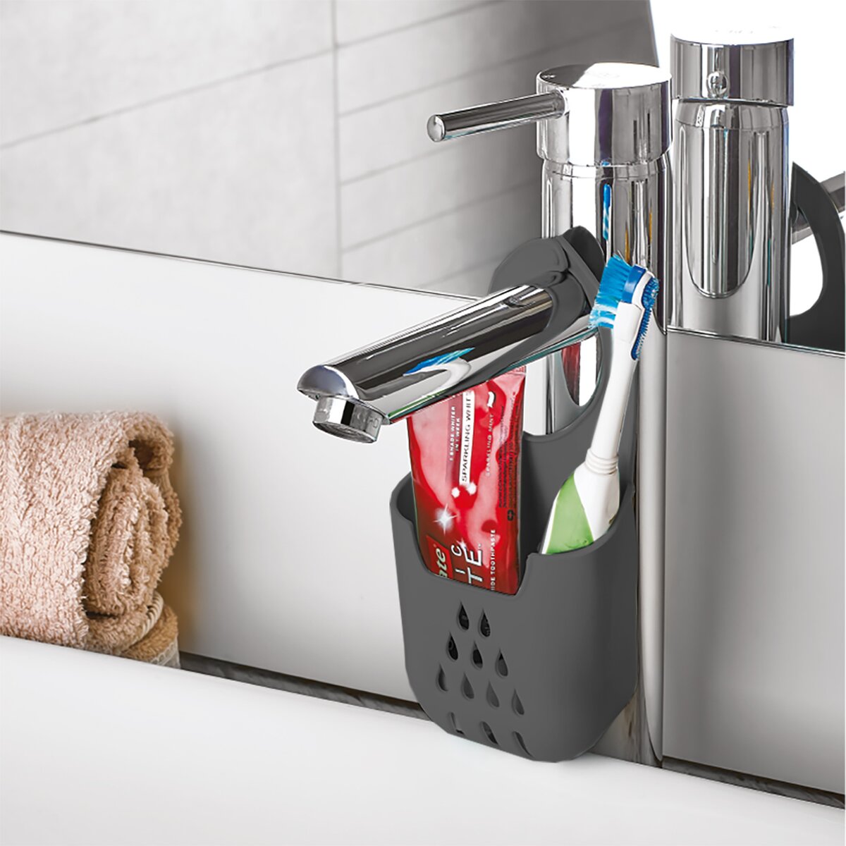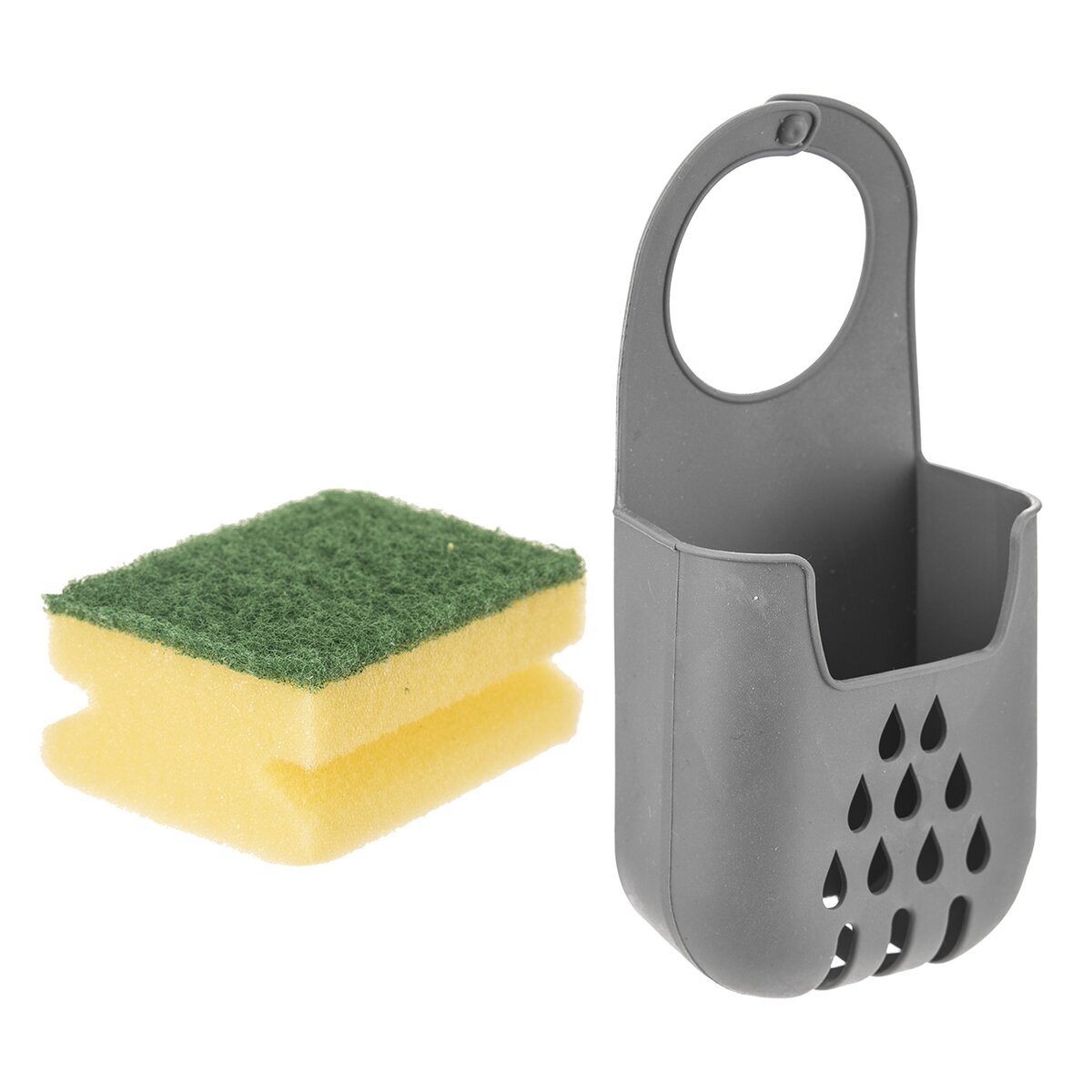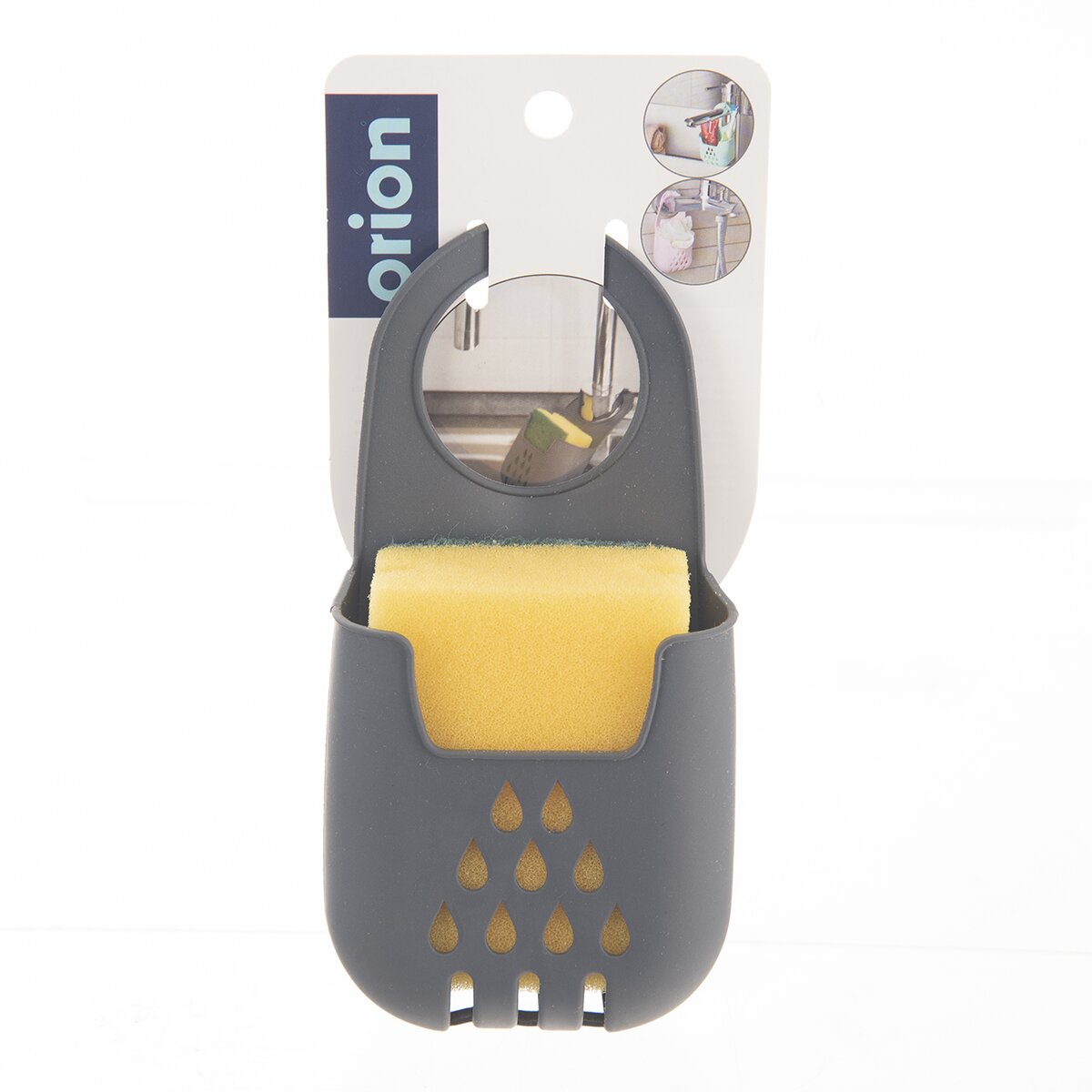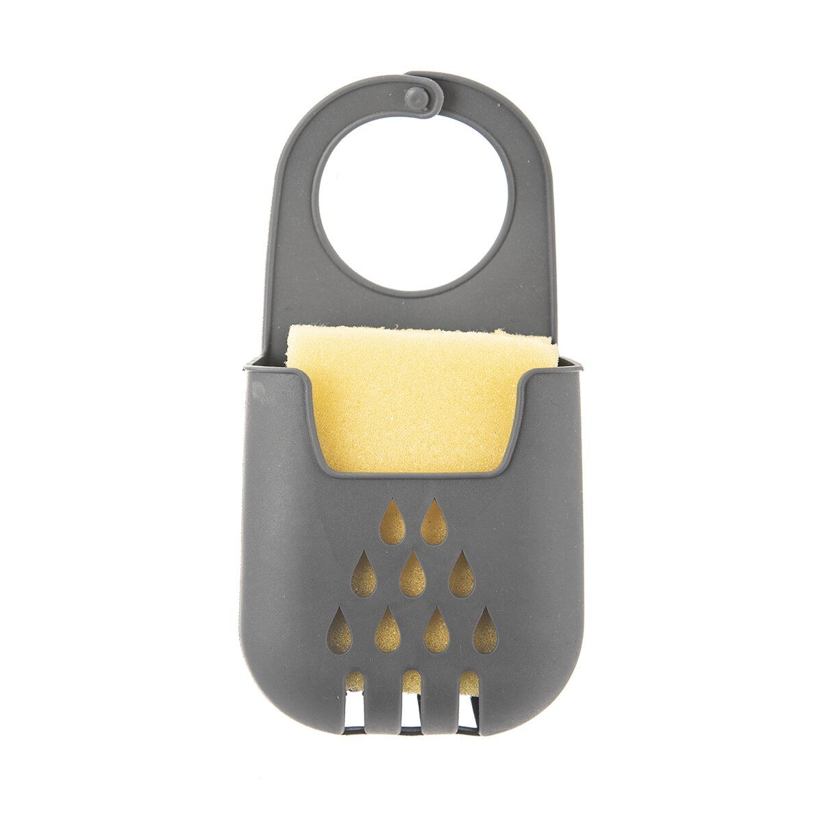 Šedý držiak z TPE plastu s otvormi v spodnej časti a rozopínacím závesom je možné pripevniť za vodovodnú batériu. Vo vnútri vložená hubka z polyuretánu je súčasťou balenia.