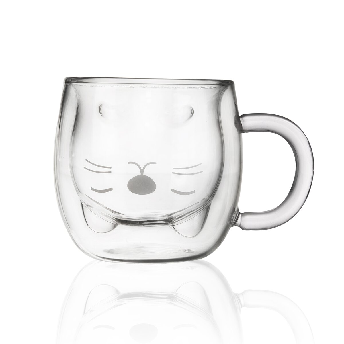 Viac informáciíDvojstenný hrnček z borosilikátového skla dokáže dlhšiu dobu udržať ideálnu teplotu obľúbeného nápoja. Vďaka vnútornej stene, ktorá tvorí tvar mačacej hlavy, bude horúca čokoláda, džús alebo vychladená malinovka vyzerať zaujímavo. Je doplnený o decentnú potlač ňufáka s fúzmi, obľúbia si ho hlavne malí labužníci.
