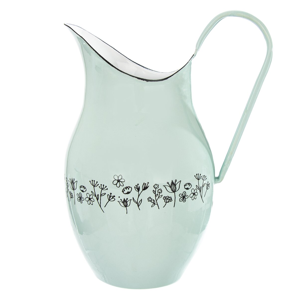 Štýlový džbán s príjemným kvetinovým motívom na zelenom podklade, výlevkou a uchom, ktorý je vyrobený z kvalitného smaltovaného plechu, ktorý zaručuje dlhú dobu používania.
