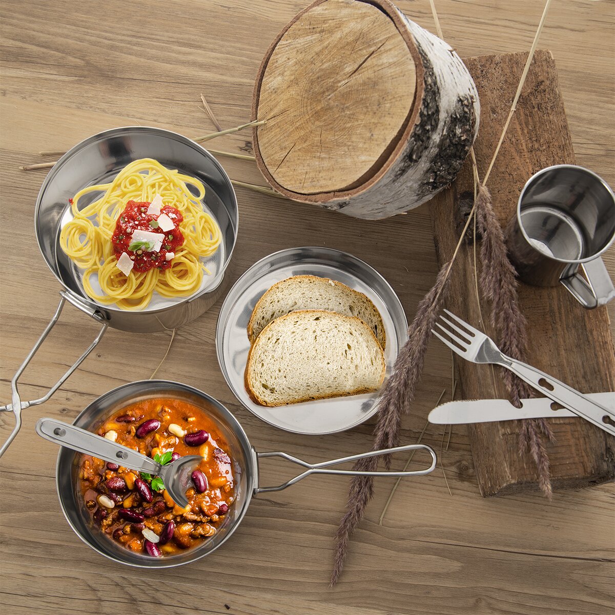 Dva nerezové ešusy s objemom 1,5 l a 0,9 l s vekom sú nevyhnutnou súčasťou pre táborenie v prírode. Táto outdoorová sada riadu navyše obsahuje nerezový hrnček a praktické skladacie príbory. Vychutnajte si poctivý guláš z kotlíka alebo jedlo z táborovej kuchyne – na čerstvom vzduchu chutí najlepšie. Pozor, ešus nie je určený na ohrievanie jedla.