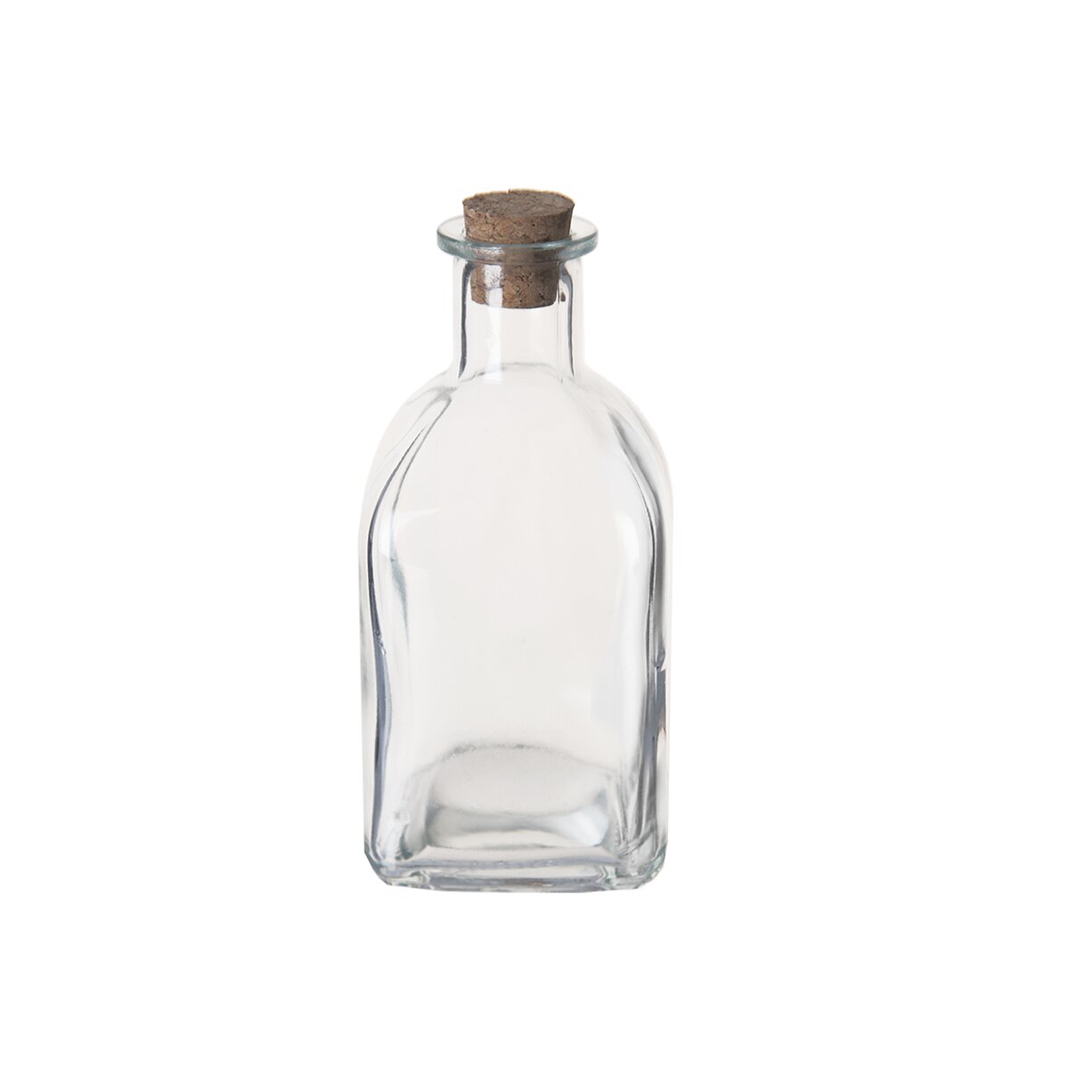 Menšia fľaša z číreho skla ponúka všestranné využitie. Má korkovú zátku a môžete ju použiť na uskladnenie tekutín, ako sú napríklad domáce likéry, šťavy, ochutené oleje aj bylinné tinktúry.