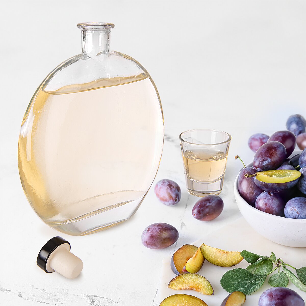 Oblá sklenená fľaša je ideálna na uloženie domácej pálenky, napr. slivovičky alebo orechovice. Hodí sa na rôzne druhy páleniek, liehovín, ale aj domáceho sirupu.