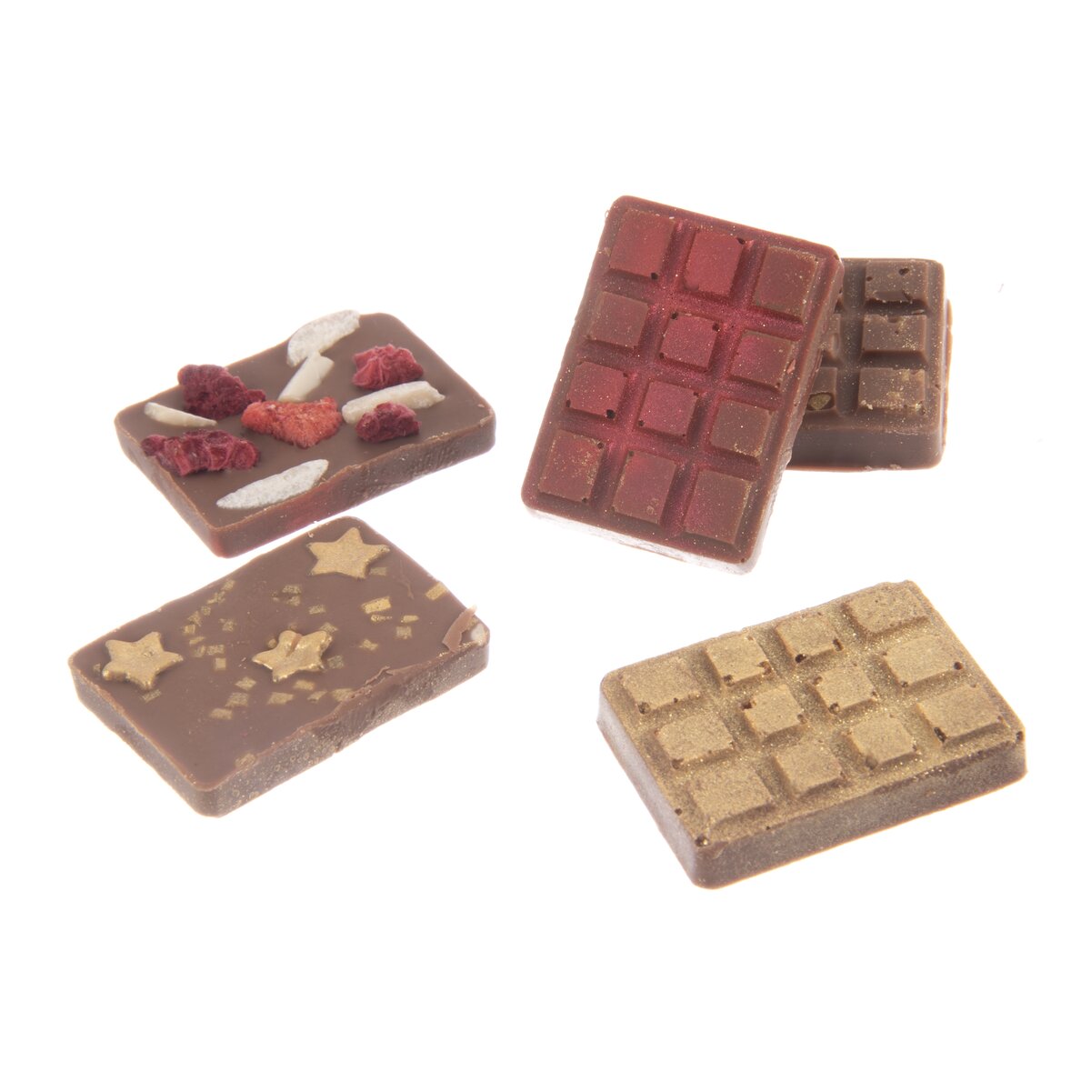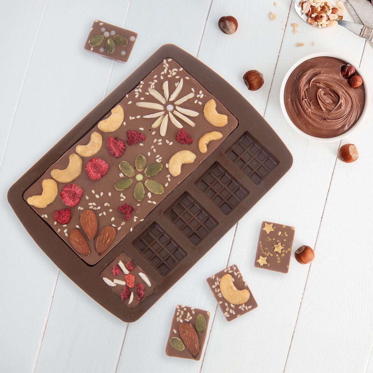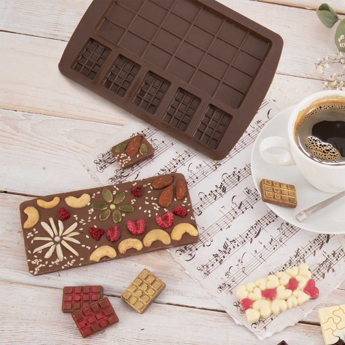 Stačí rozpustenú čokoládu naliať, pridať orechy, sušené ovocie, sušenú levanduľu alebo netradične čili či korenie a nechať stuhnúť v chladničke. Jednotlivé čokoládky z pružnej formy jednoducho vylúpnete, prípadne poprášite metalickým jedlým púdrom, aby vyzerali naozaj luxusne. Uvidíte, že budú aj skvelým darčekom pre milú osobu, partnera, mamičku a pod. Veľká tabuľka má rozmer 15x7,5 cm, malé 3,5x2,5 cm.