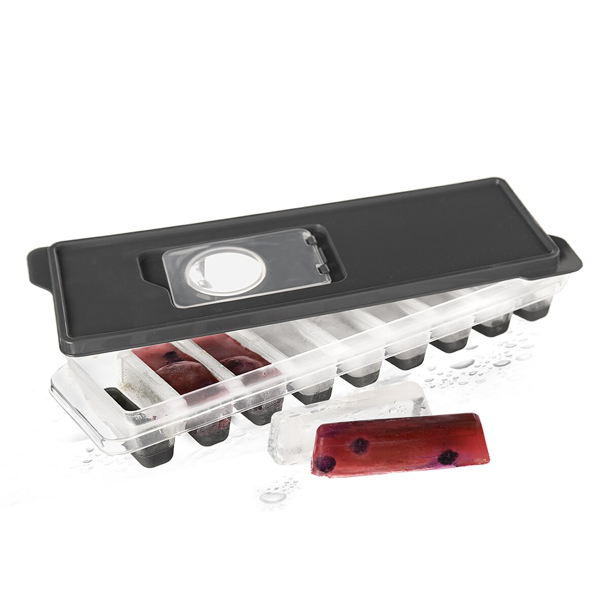 Forma na ľad s viečkom Vám vytvorí ľadové tyčinky na ochladenie nápojov. Vďaka mäkkému silikónu na dne formičiek pôde ľad jednoducho vybrať z formy. Materiál: plast, silikón. Mix farieb. Rozmery: 26,5x9x3,5 cm, d. tyčinky 7 cm.