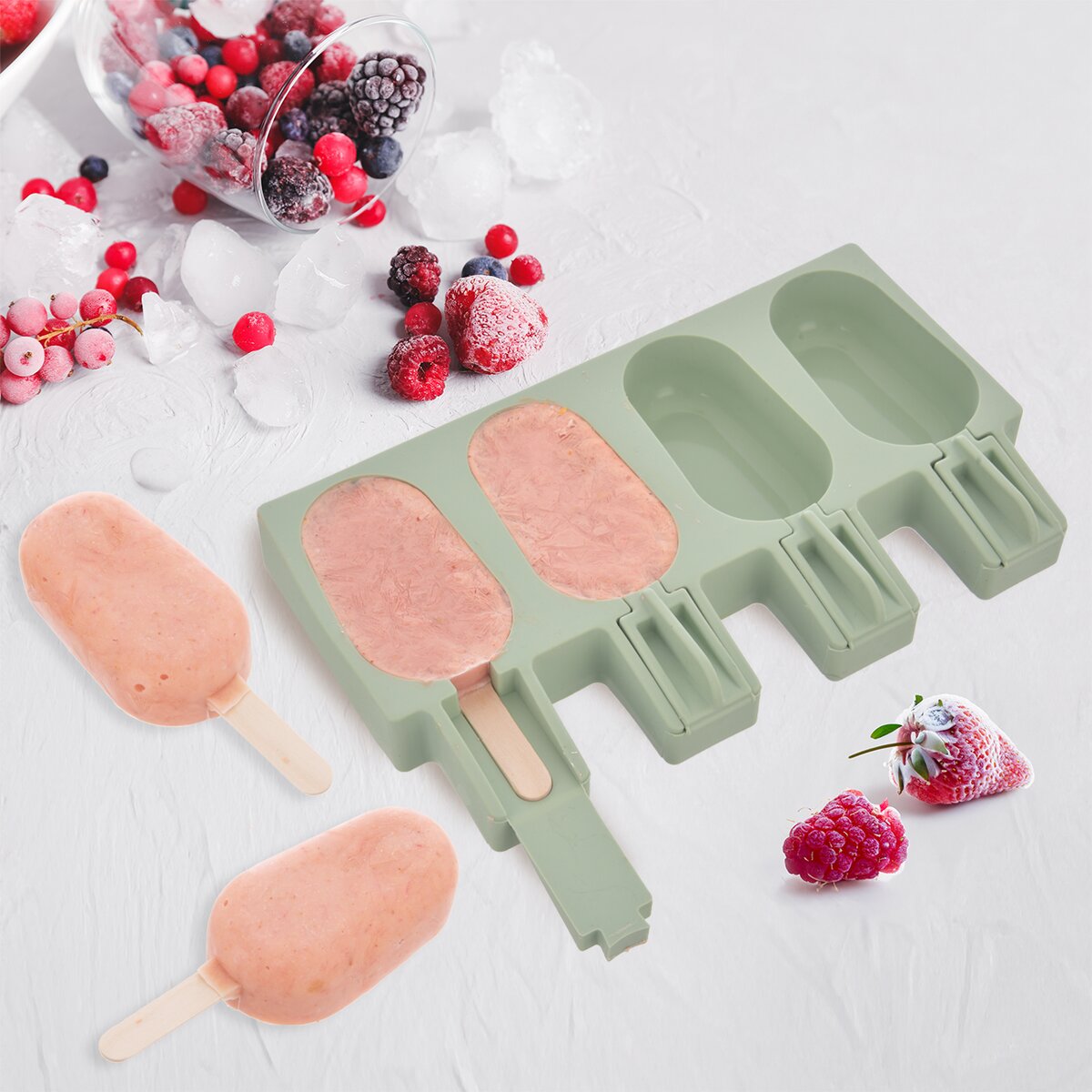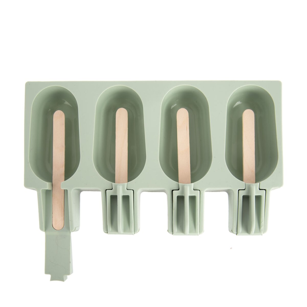 Kód produktu 154409Zelená silikónová forma so 4 priehlbinami a 24 kusmi drevených tyčiek slúži na výrobu osviežujúcich domácich nanukov i nepečených dezertov poliatych čokoládou alebo inou polevou.