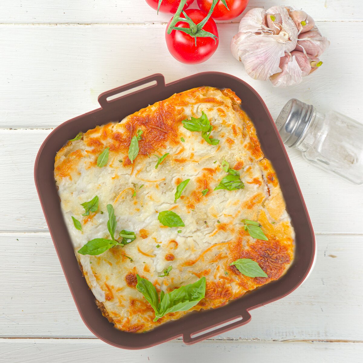 Kód produktu 154406Nepriľnavá silikónová forma s držadlami v rozmere 17,5x17,5x6,5 cm je určená do teplovzdušnej fritézy aj pre klasické pečenie a zapekanie v bežnej rúre.