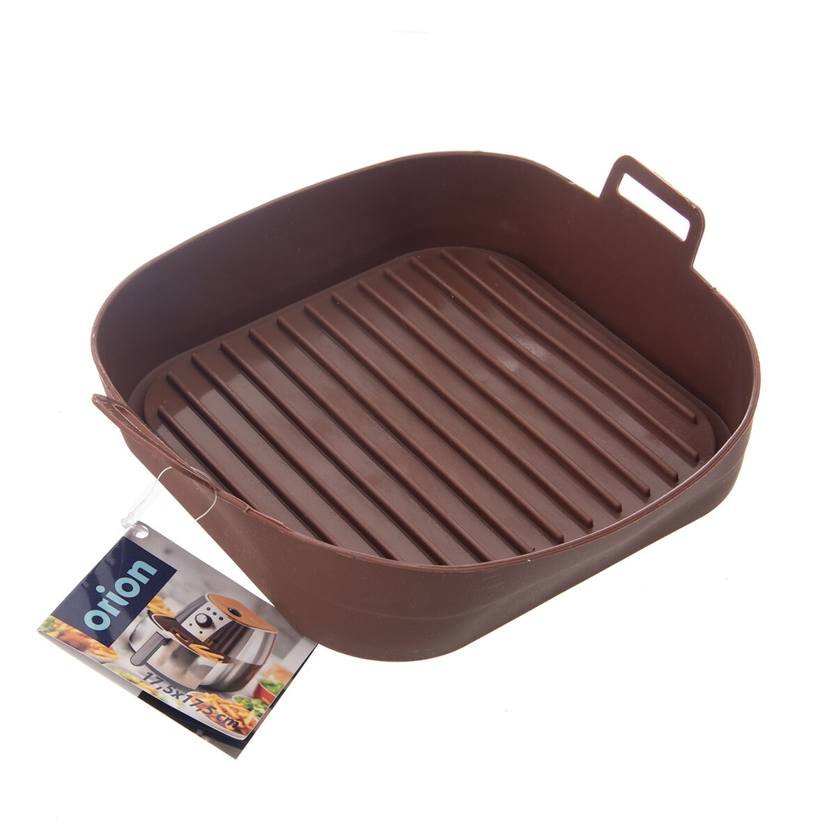 Viac informáciíNepriľnavá hnedá silikónová forma je určená ako na pečenie v bežných typoch rúr v domácnosti, tak aj ako vložka do teplovzdušnej fritézy. Práve vďaka nej si môžete ľahko, rýchlo a takmer bez tuku pripraviť hranolky, kuracie krídelká, stripsy a ďalšie obľúbené dobroty, ktoré by v normálnom fritovacom hrnci nasiakli veľkým množstvom oleja. Zároveň ochráni kôš alebo sito vo fritéze bez toho, aby strúhanka alebo malé kúsky mäsa či zeleniny prepadávali dovnútra alebo došlo k jej ušpineniu či poškriabaniu. Má výšku bez držadiel 4,5 cm.
