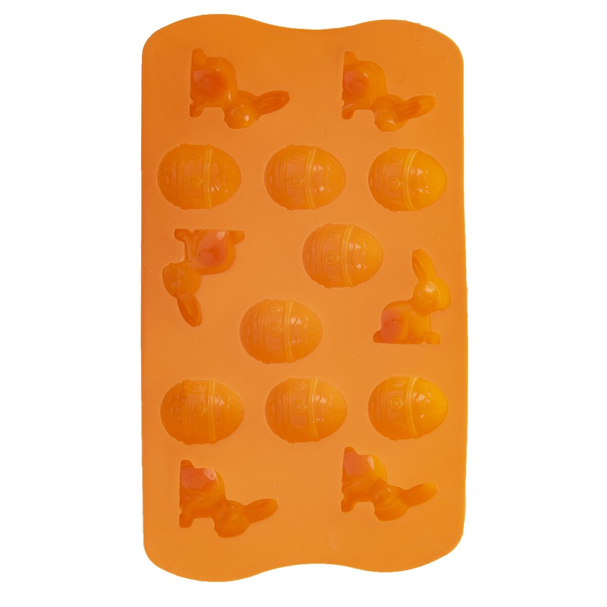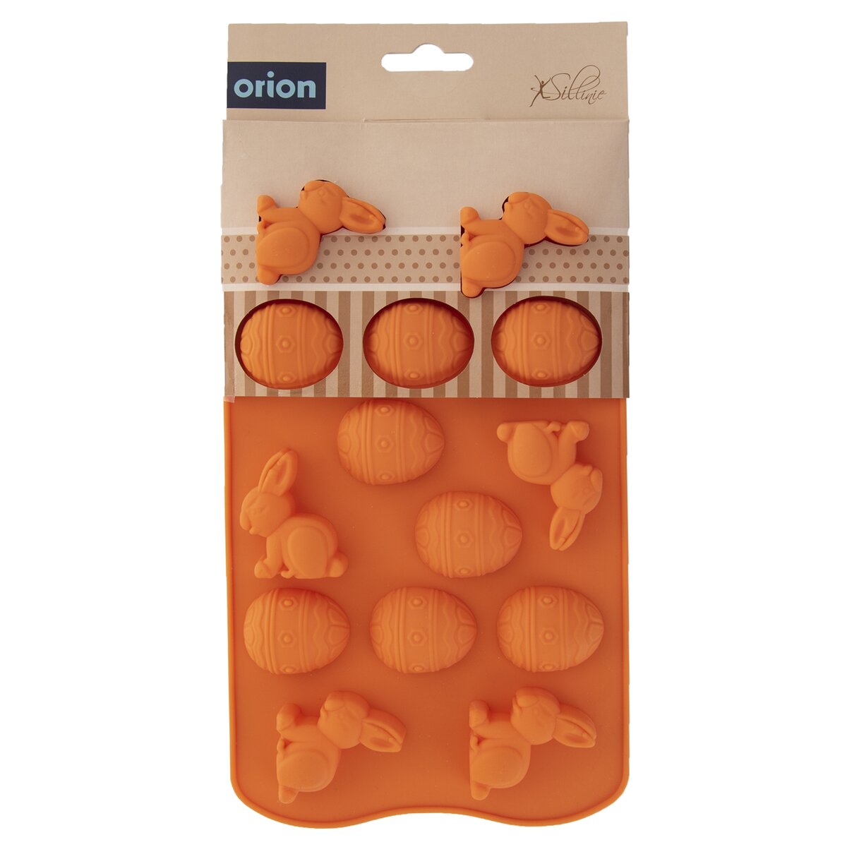 Kód produktu 151749Nepriľnavá veľkonočná oranžová silikónová forma pre rýchle a rovnomerné pečenie 14 ks sušienok v tvare zajačikov a vajíčok alebo na výrobu originálnych praliniek.