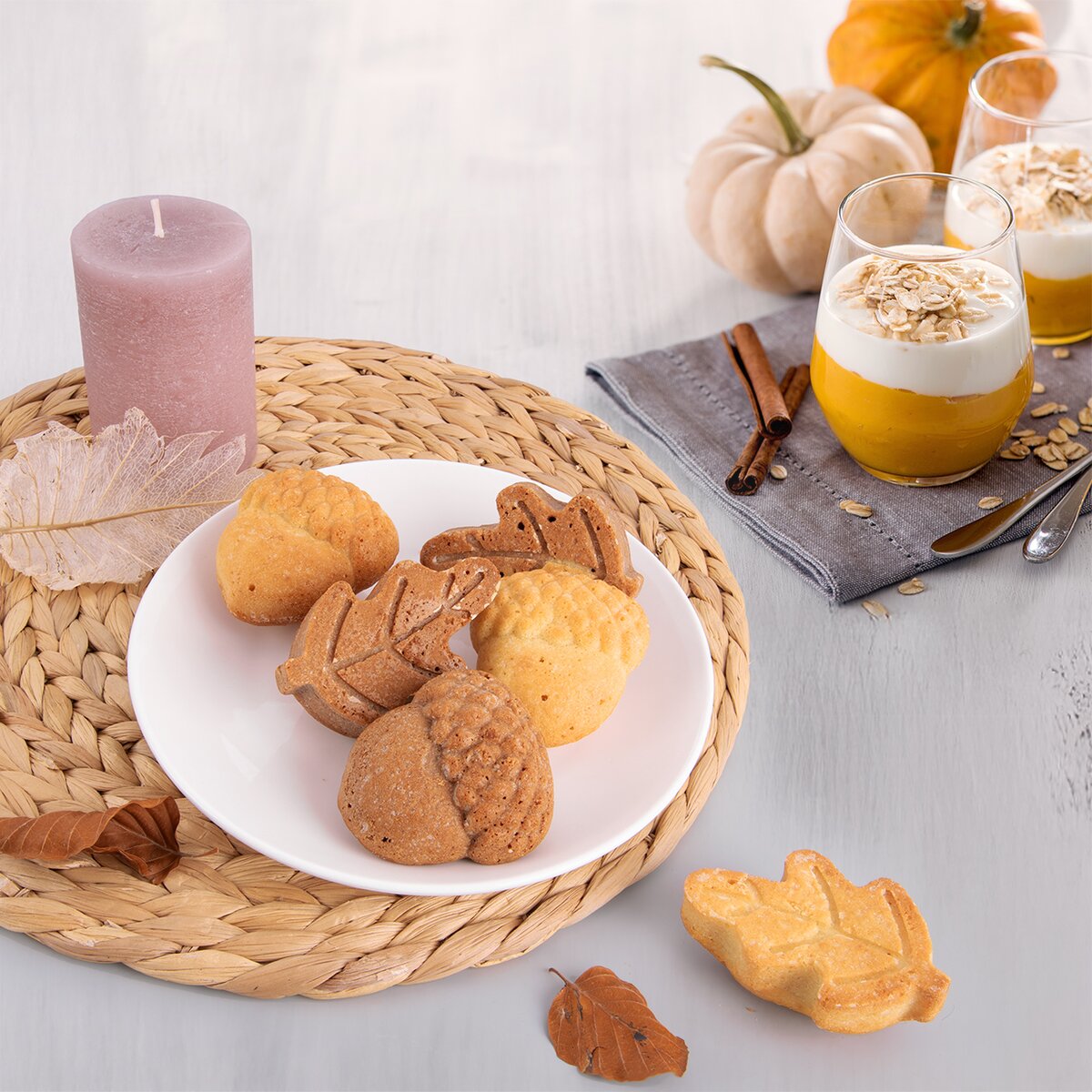 Viac informáciíPečte tradične, ale v netradičných nepriľnavých formách. Jesenné pečenie v tematických tvaroch bude jednoduchšie vďaka pružnej forme. Listy či žalude z liateho alebo piškótového cesta, zdobené polevou či posypom, sú obľúbeným dezertom k popoludňajšiemu čaju. Hodí sa aj na prípravu malých cheesecakov, panna cotty aj domáce paštéty. Alebo na zaujímavý puding so sezónnym ovocím.