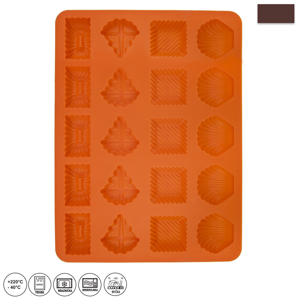 Sušienky 20 ks, rozmery (šxhxv): 28,5x21x1,5 cm.Silikónové formy sú ľahké a nepriľnavé, cesto sa v nich nepripeká, nepreberajú pachy z potravín. Odolné teplotám od -40 °C do +220 °C. Ľahké umývanie v umývačke riadu, sú veľmi skladné.