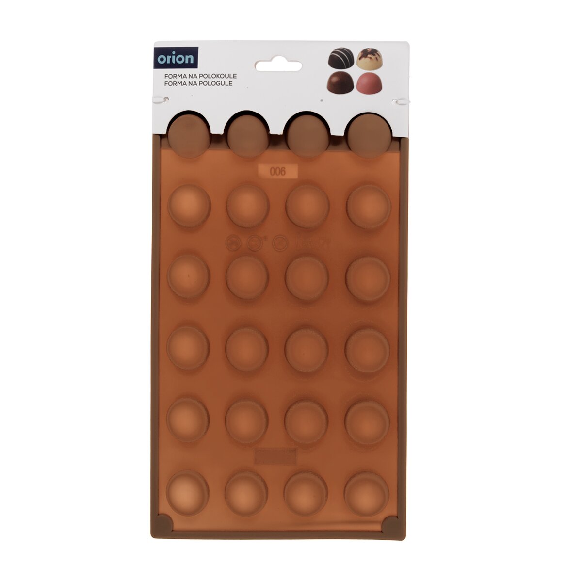Kód produktu 154443Nepriľnavá hnedá silikónová forma je vhodná na pečenie 24 ks malých sušienok alebo na výrobu originálnych čokoládových praliniek a cukríkov v tvare pologule.