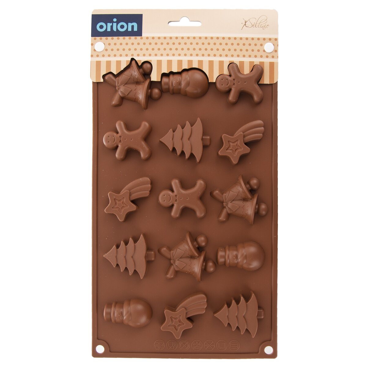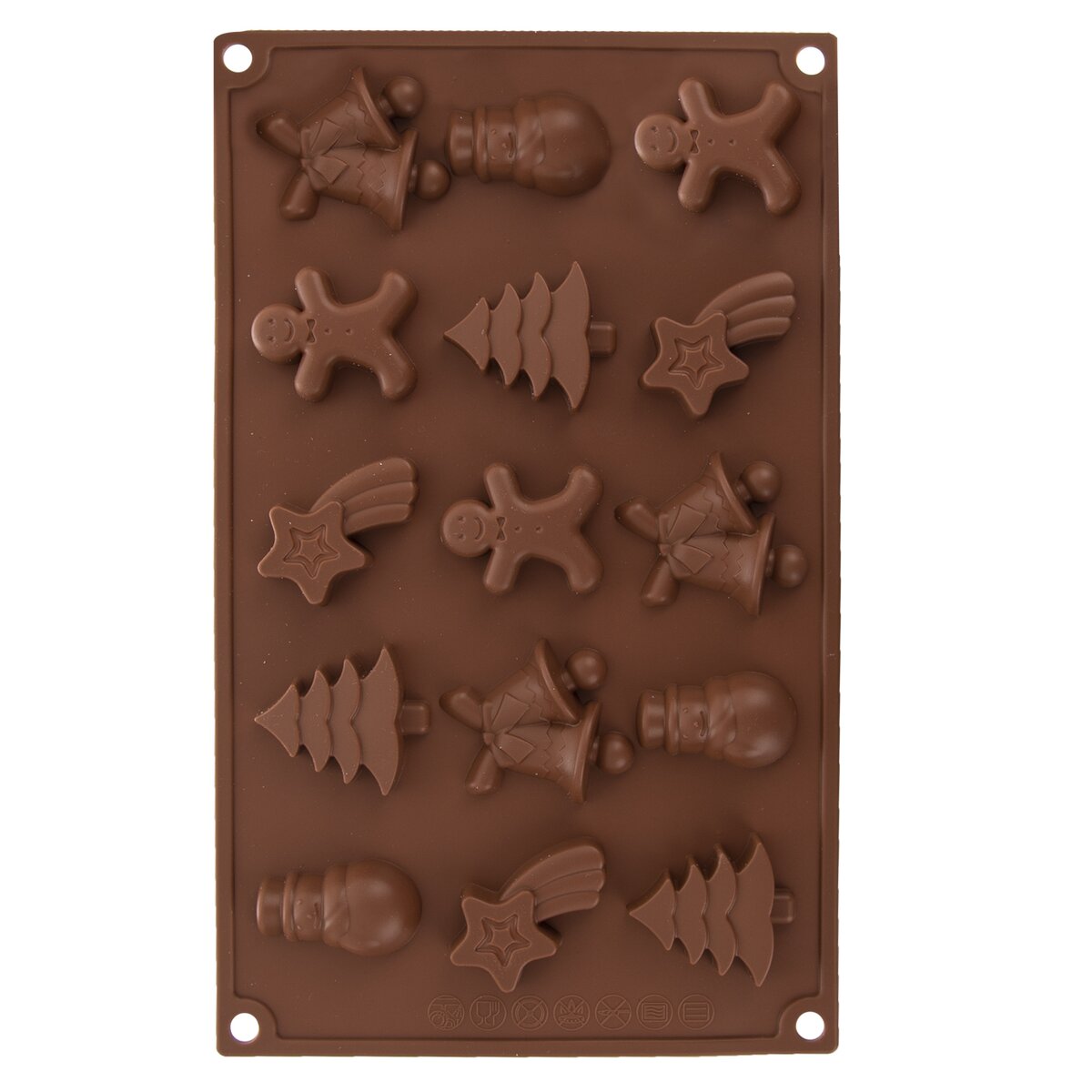 Kód produktu 120051Silikónová forma Vám vytrvorí dobroty z čokolády vo vianočných tvaroch – stromček, kométa, zvončeky, panáčik, snehuliak. Materiál: silikón. 15 foriem. Znáša vysoké teploty (od -40 °C do +220 °C), neprenáša chute ani vône z použitých potravín. Vhodná do umývačky riadu. Môžete využiť tiež ako formu na ľad. Rozmery: 29x17x1,5 cm, tvary cca 4,5x3 cm.