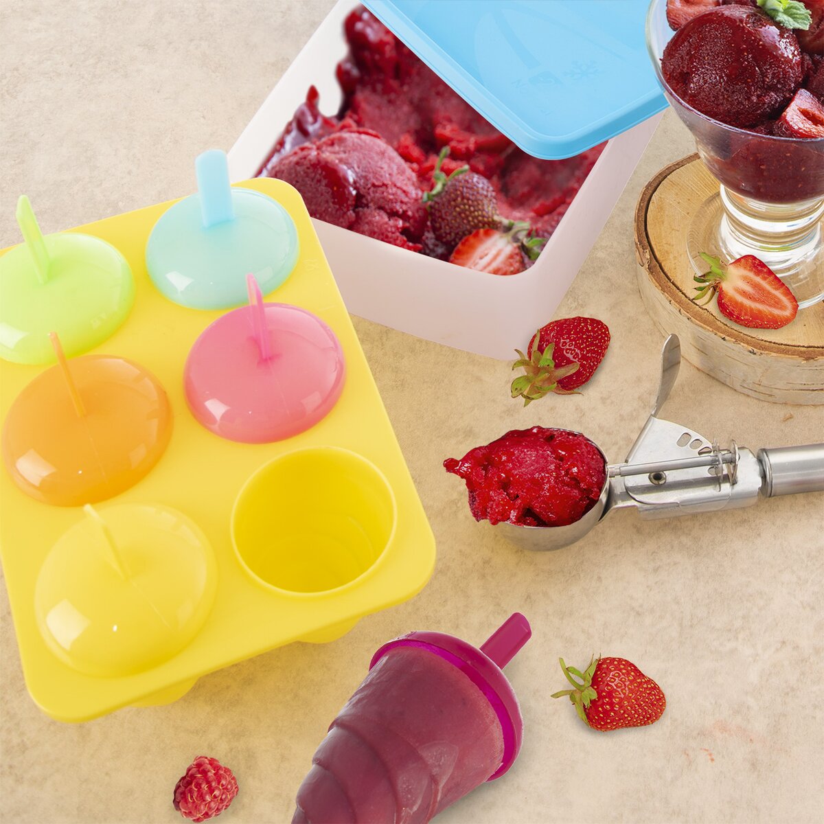 Či už milujete rozmixované ovocie, zmrazené domáce ovocné šťavy, alebo experimentujete s viacfarebnými smotanovými nanukmi, stačí zmes naliať do formy, vložiť viečko s hrotom a nechať zamraziť.
