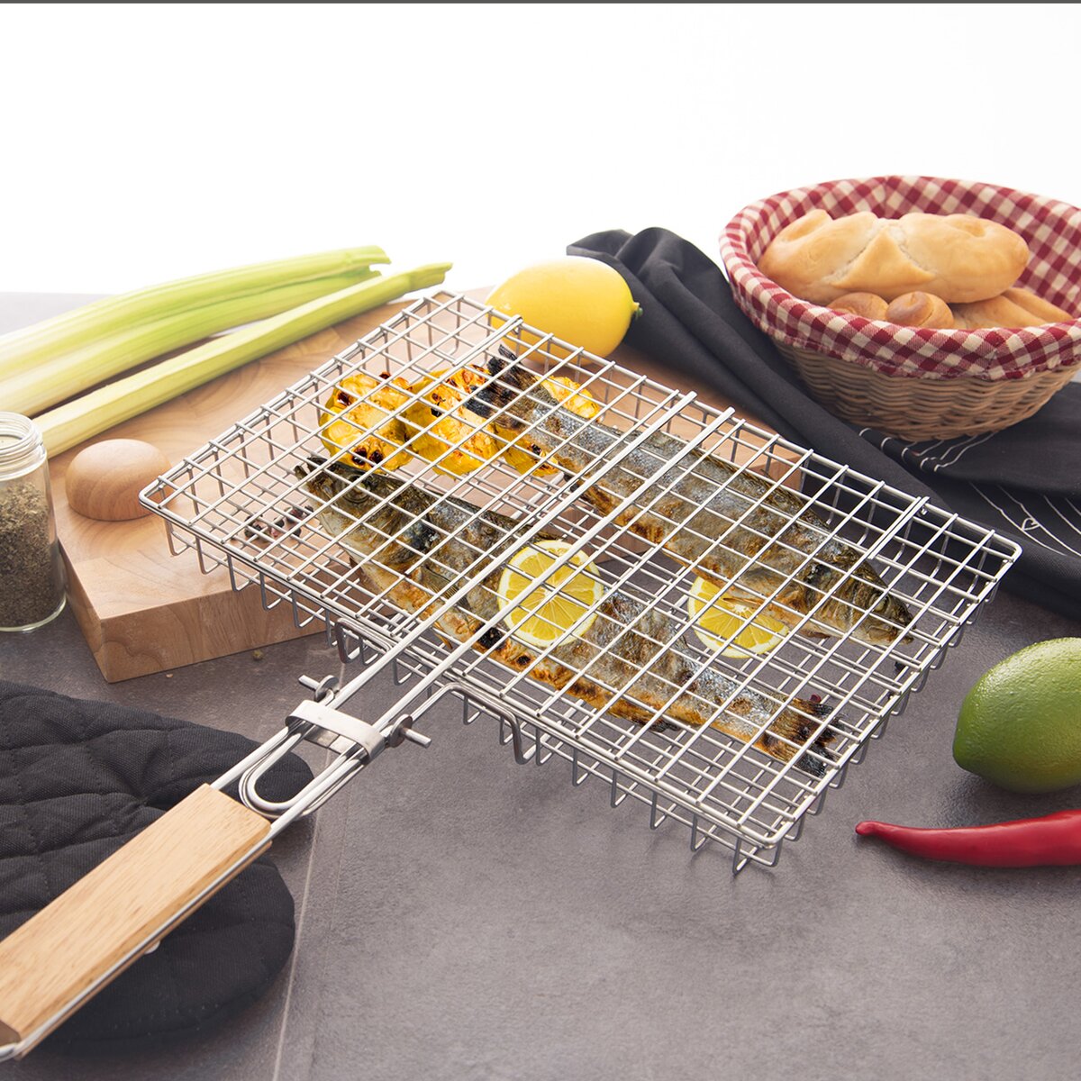 Kód produktu 111186Kovová pochrómovaná mriežka na grilovanie rýb, mäsa i zeleniny uľahčí otáčanie a rovnomerné grilovanie z oboch strán. Dostatočne dlhá, sklopná rukoväť s držadlom z gumovníkového dreva zabráni popáleniu rúk od žiaru.