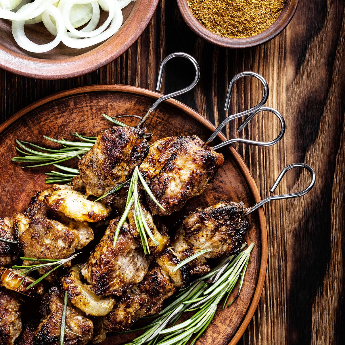 Nerezové ihly s očkom pre ľahké napichovanie mäsa, údenín, zeleniny a ich následné pečenie v rúre, na panvici.