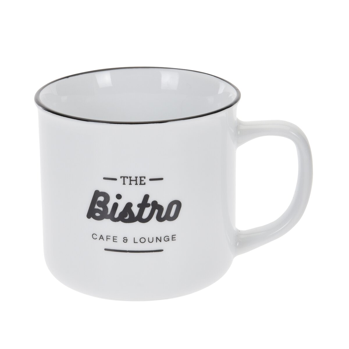 Kód produktu 125644Biely porcelánový hrnček s objemom 320 ml s čiernym nápisom ako zo štýlového amerického bistra.