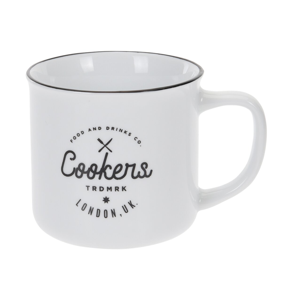 Biely porcelánový hrnček COOKERS pre milovníkov kaviarní, bistier a reštaurácií. Vďaka objemu 320 ml je výborný napríklad na čaj, varené víno, horúcu čokoládu, ale aj väčšiu kávu.