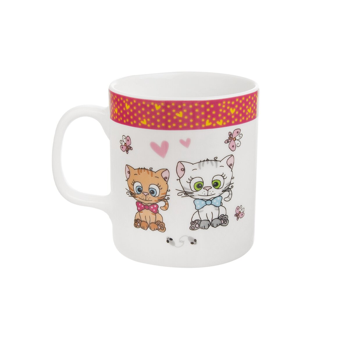 Menší porcelánový hrnček s pekným dekorom dvoch roztomilých kocúrikov s mašľou je ako stvorený na dopĺňanie tekutín pre deti od 3 rokov. Malí nezbedi si z neho vychutnajú sladučké kakao, čaj, ochutené mlieko i domácu šťavu.