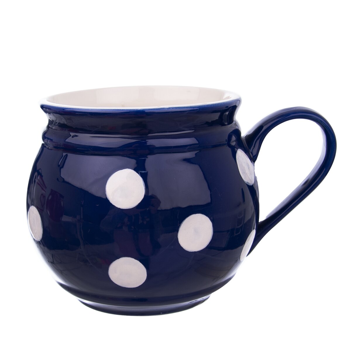 Hrnček s uchom na poriadnu dávku bielej kávy, melty, čaju,.... Dekór bodka - 3 farebné varianty - séria riadu KRAJÁČ. Krásna dekorácia do interiérov chalúp a štýlových kuchýň. Materiál: keramika (môže sa stať, že vplyvom tepla popraská vnútorná glazúra a tekutiny, ktoré farbia, môžu vytvoriť tmavý odtieň vo vnútri nádoby.Nie je to závada, je to klasický jav u keramických nádob. Nemôže byť dôvodom reklamácie). Rozmery: objem 1 l, pr. 13 cm, v. 11 cm.